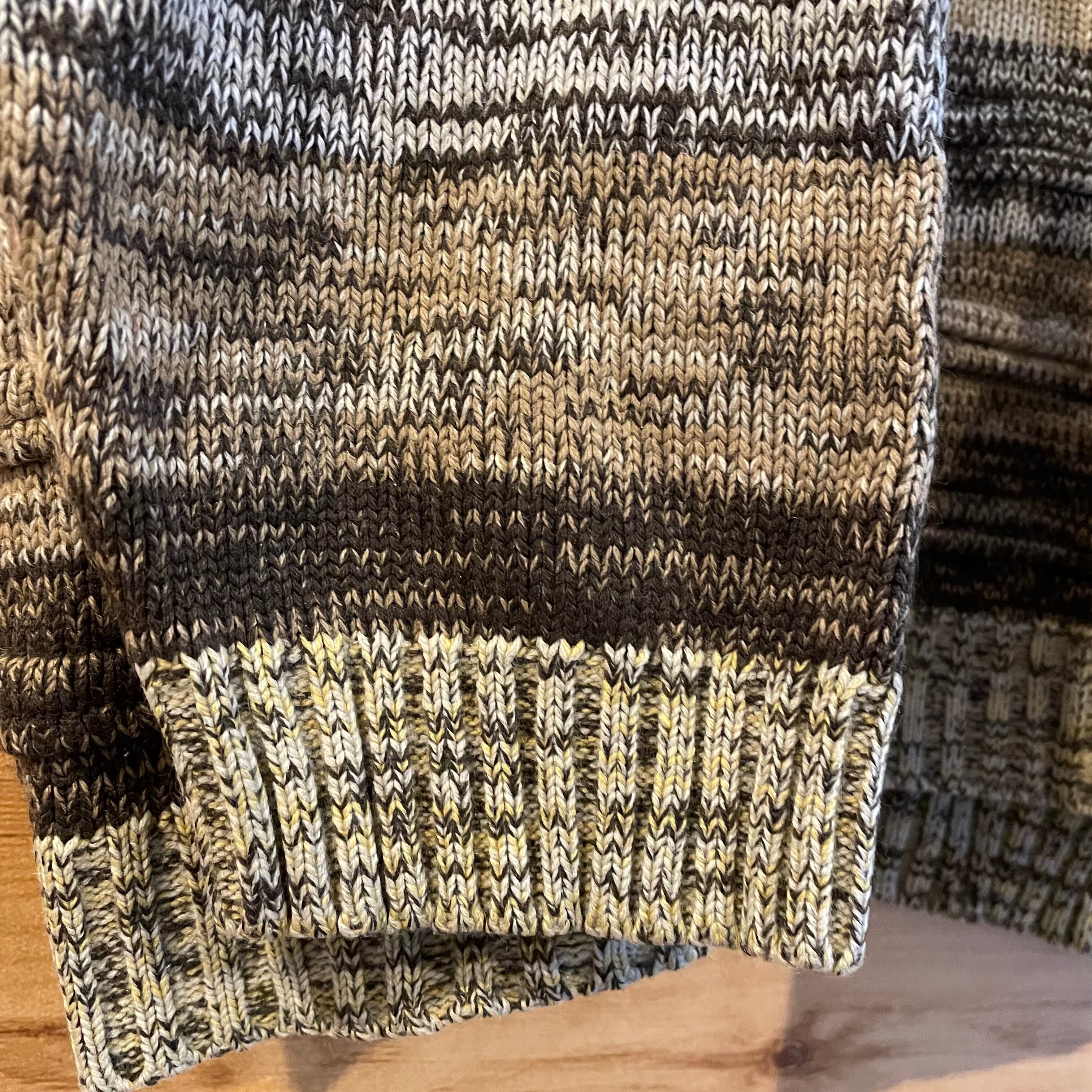 クルーネック、袖にブランドのパッチ、立体ボーダーの個性的な一着です。