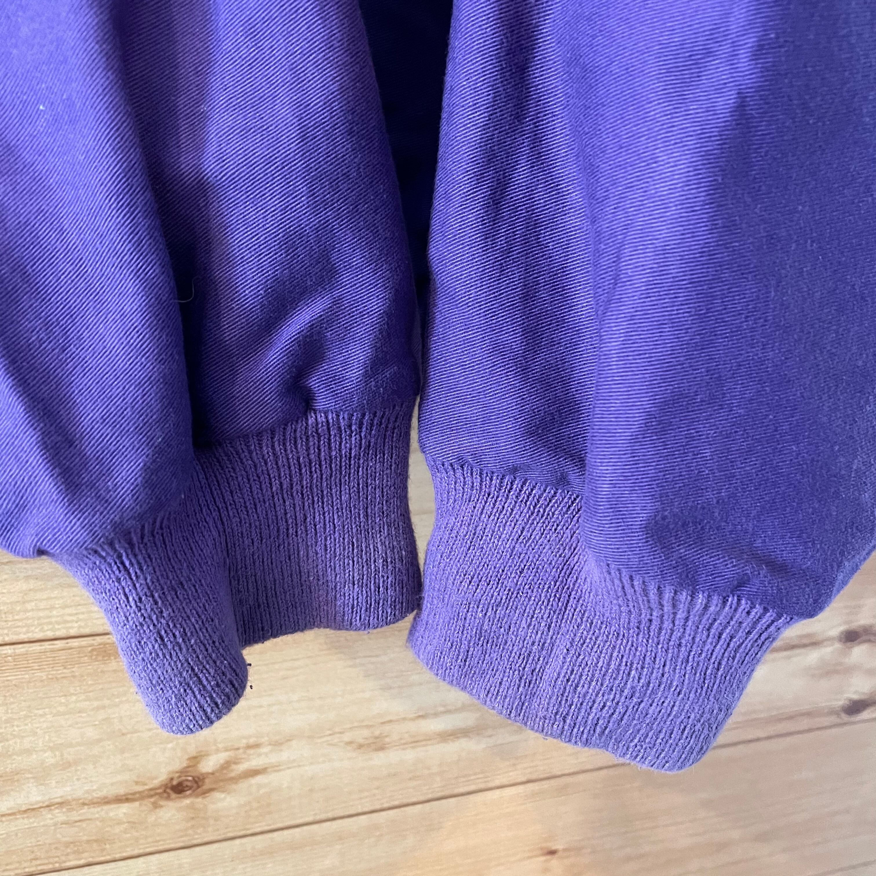 100%コットンのしっかりとした作り、ハーフジップ、カンガルーポケット、胸と背中に刺繍ロゴが入る希少な一着です。