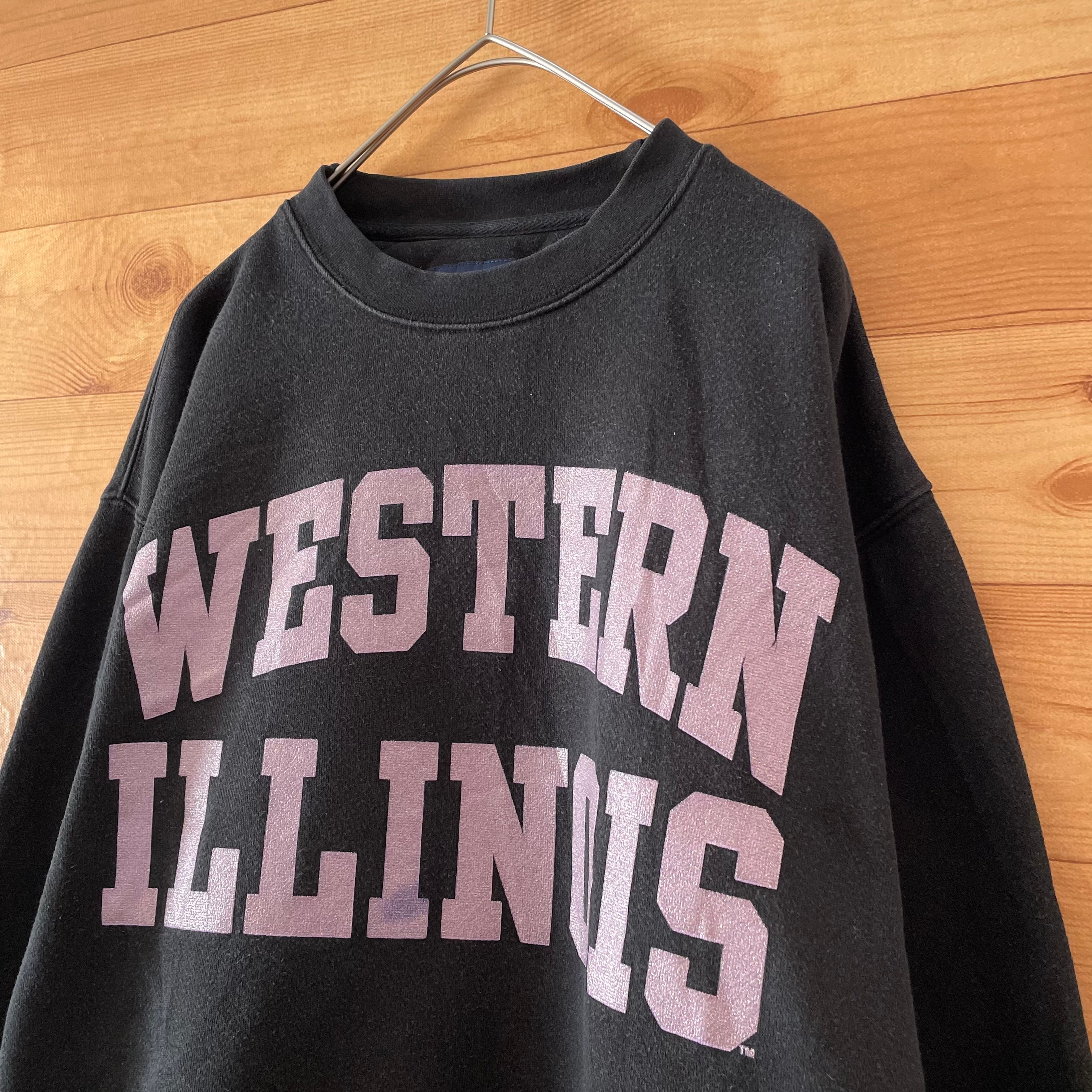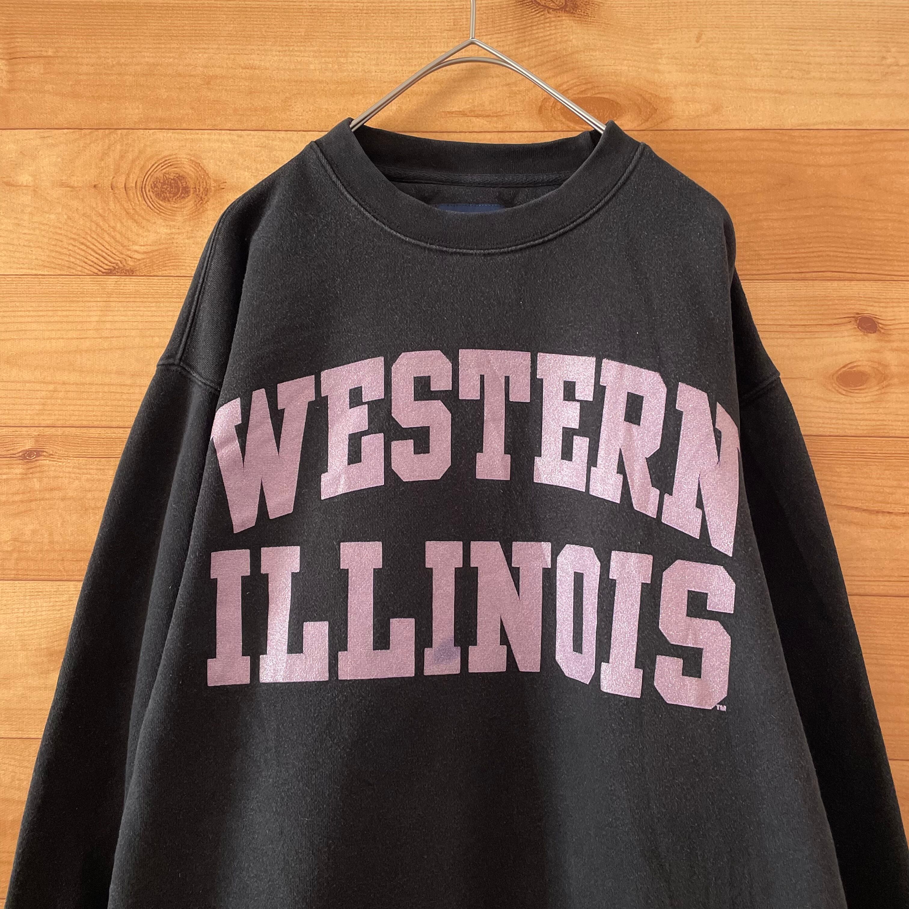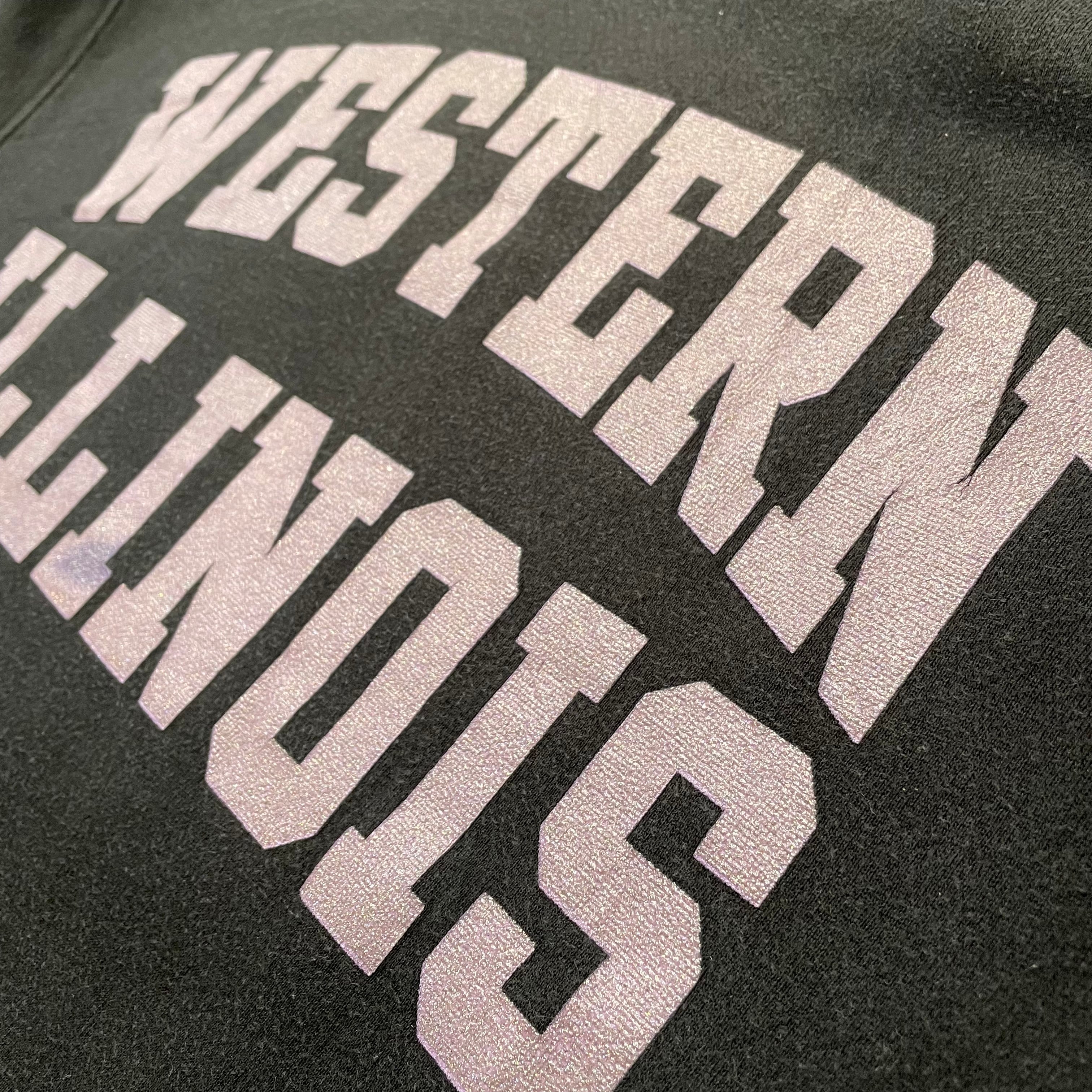胸にWESTERN ILLINOISのラメ入りロゴがプリントされ、袖にブランドバッチが刺繍されています。