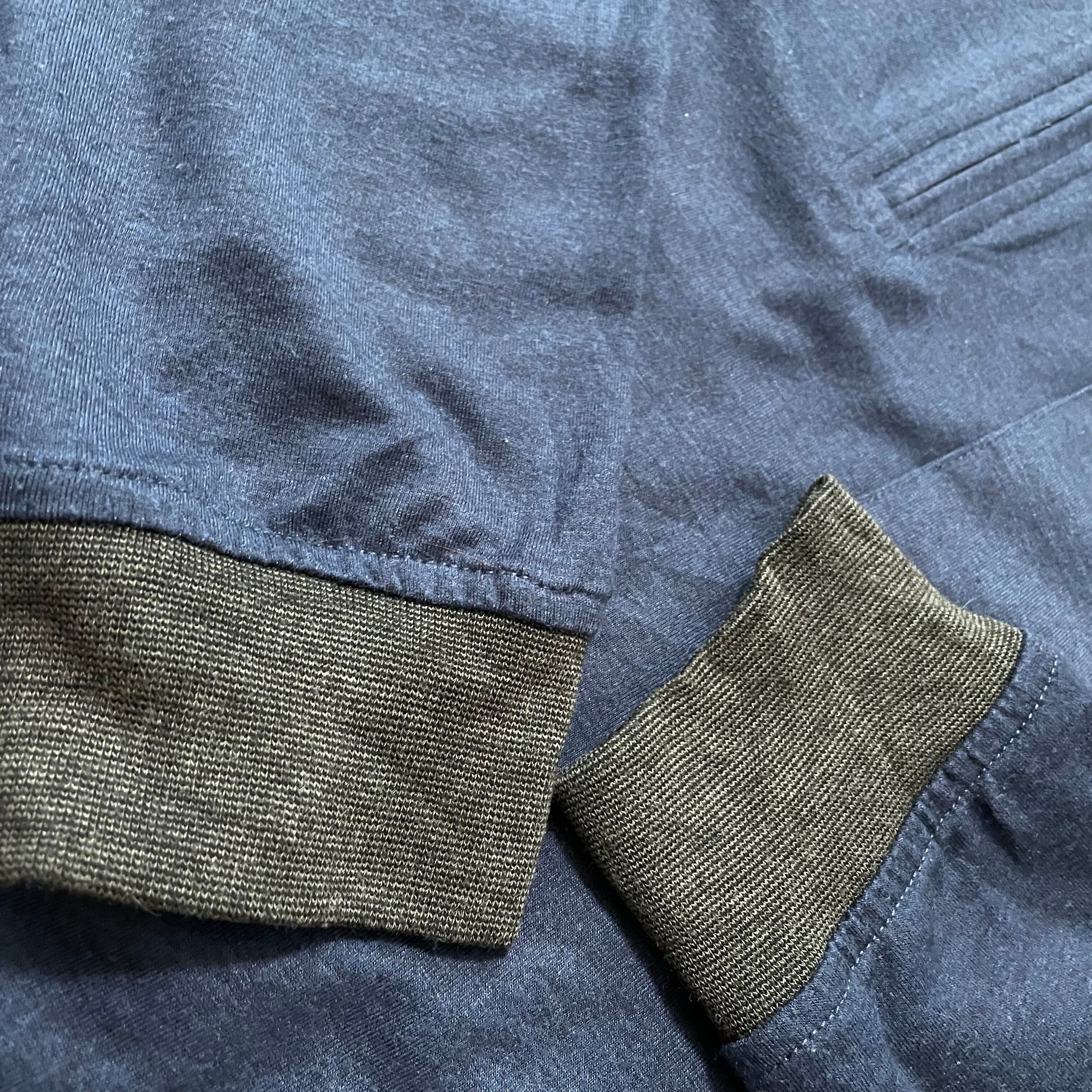 薄手で落ち着いたネイビーのボディ、ボタン付きの胸ポケット付きです。