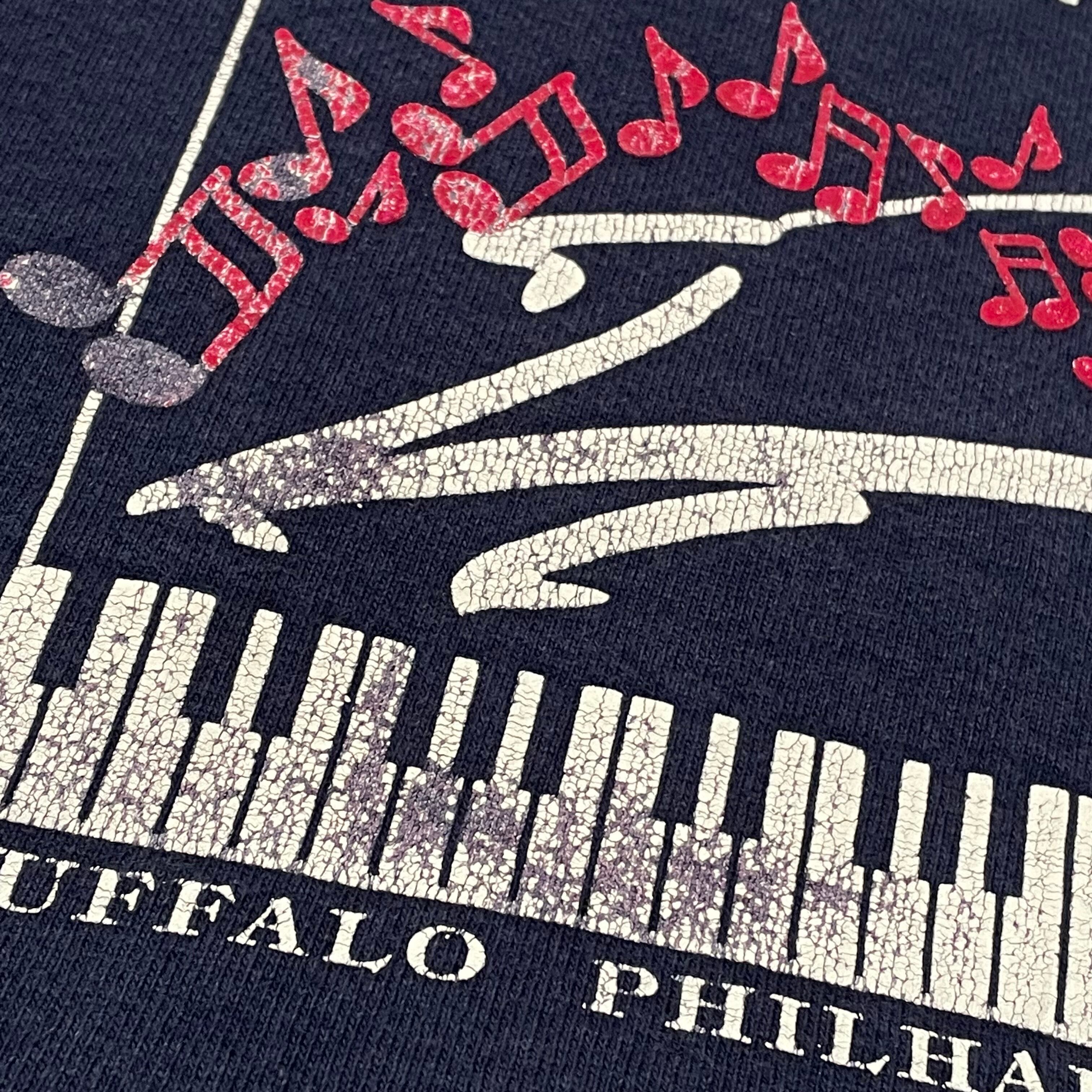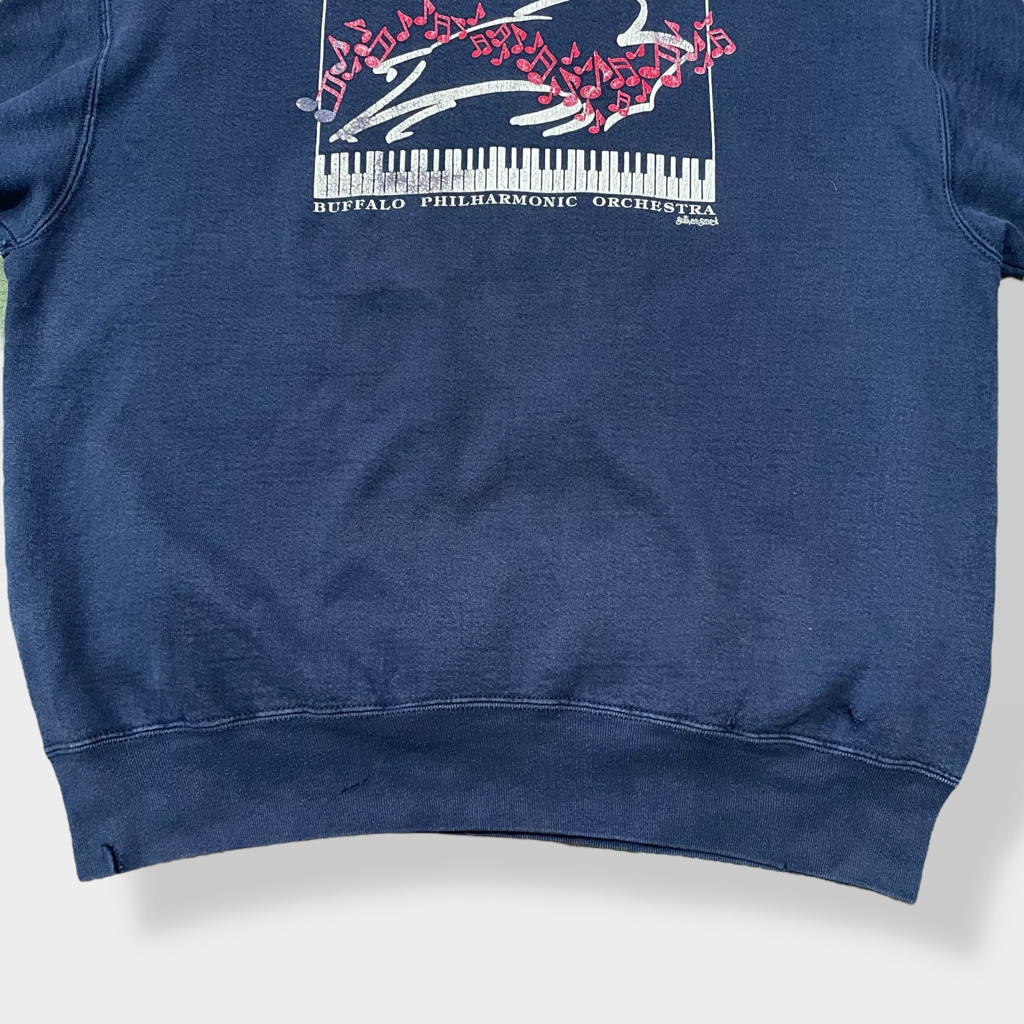 ピアノの鍵盤がプリント されたバッファローシンフォニックオーケストラのスウェットです。色褪せ具合も雰囲気のある一着です。