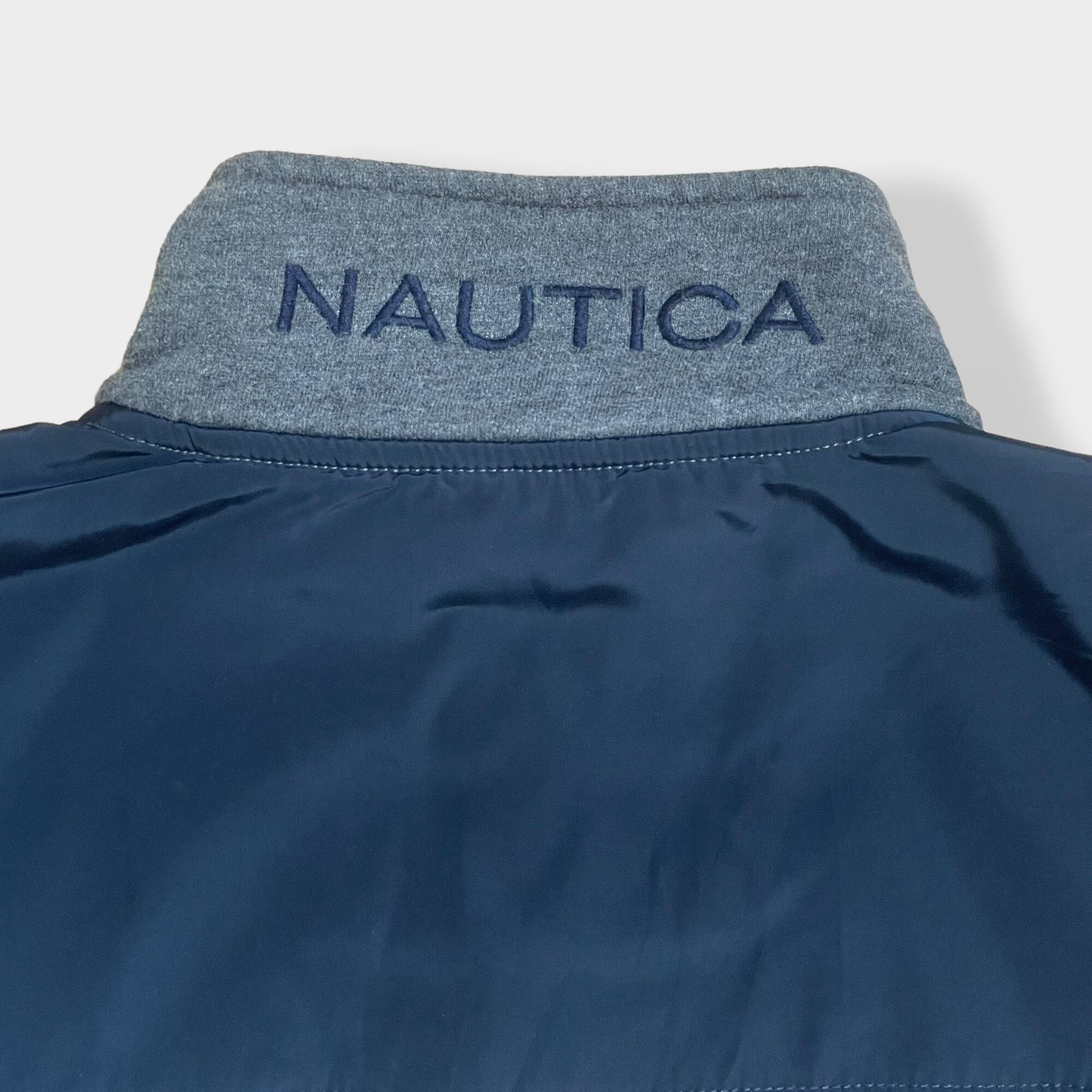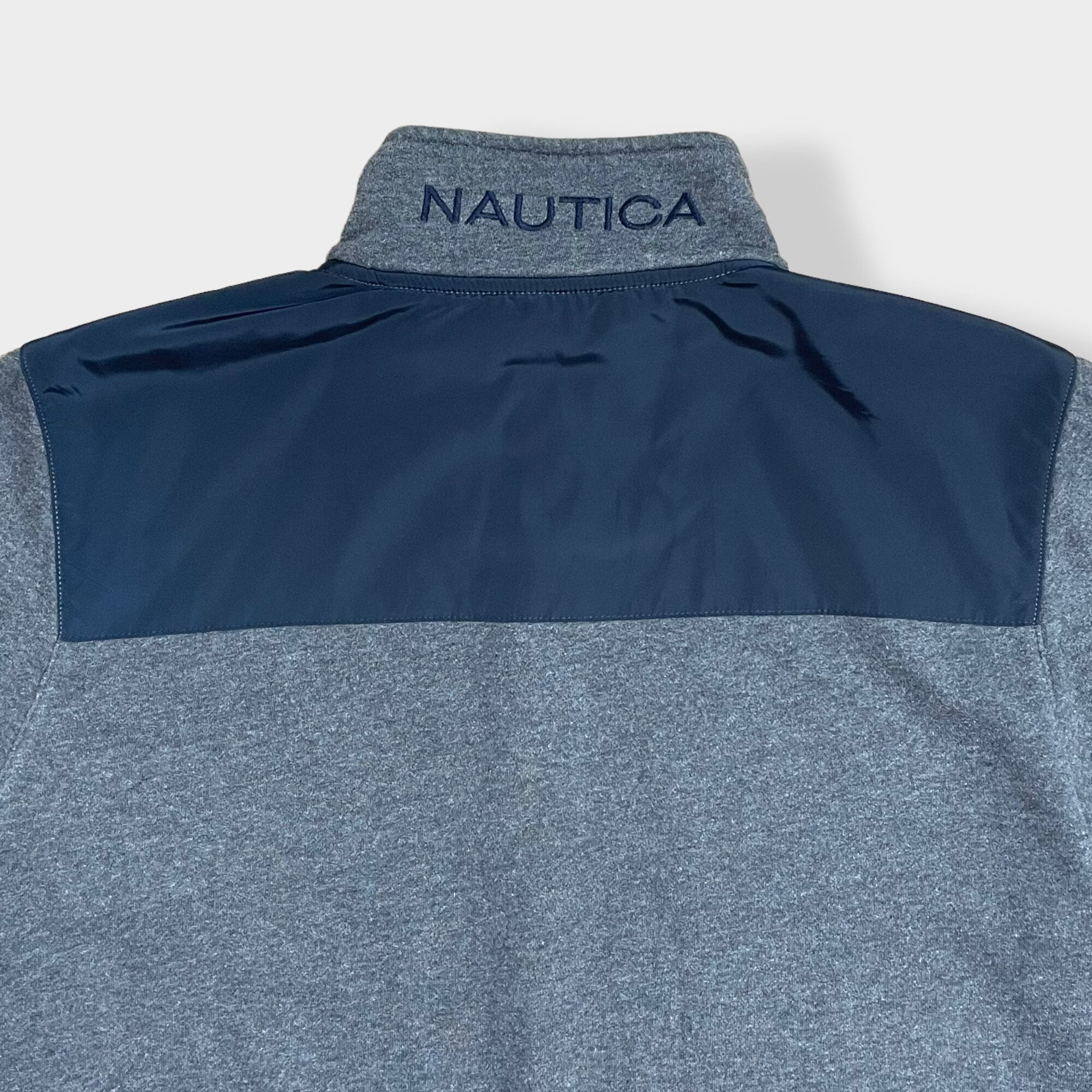 胸にブランドロゴ、襟後ろにNAUTICAの刺繍、バックヨークはネイビーのポリ素材に切替の一着です。