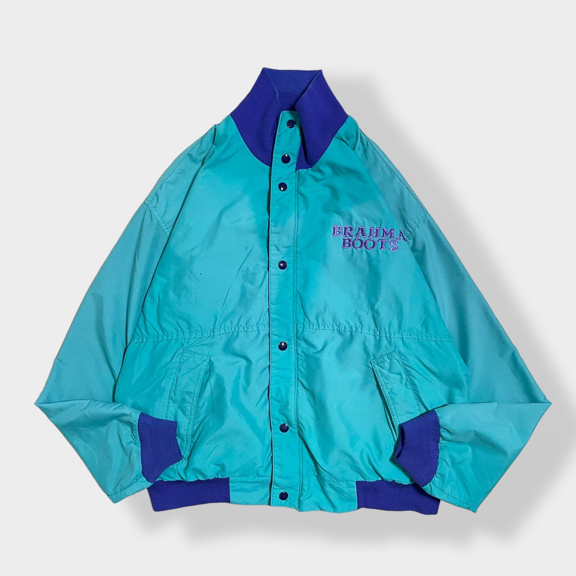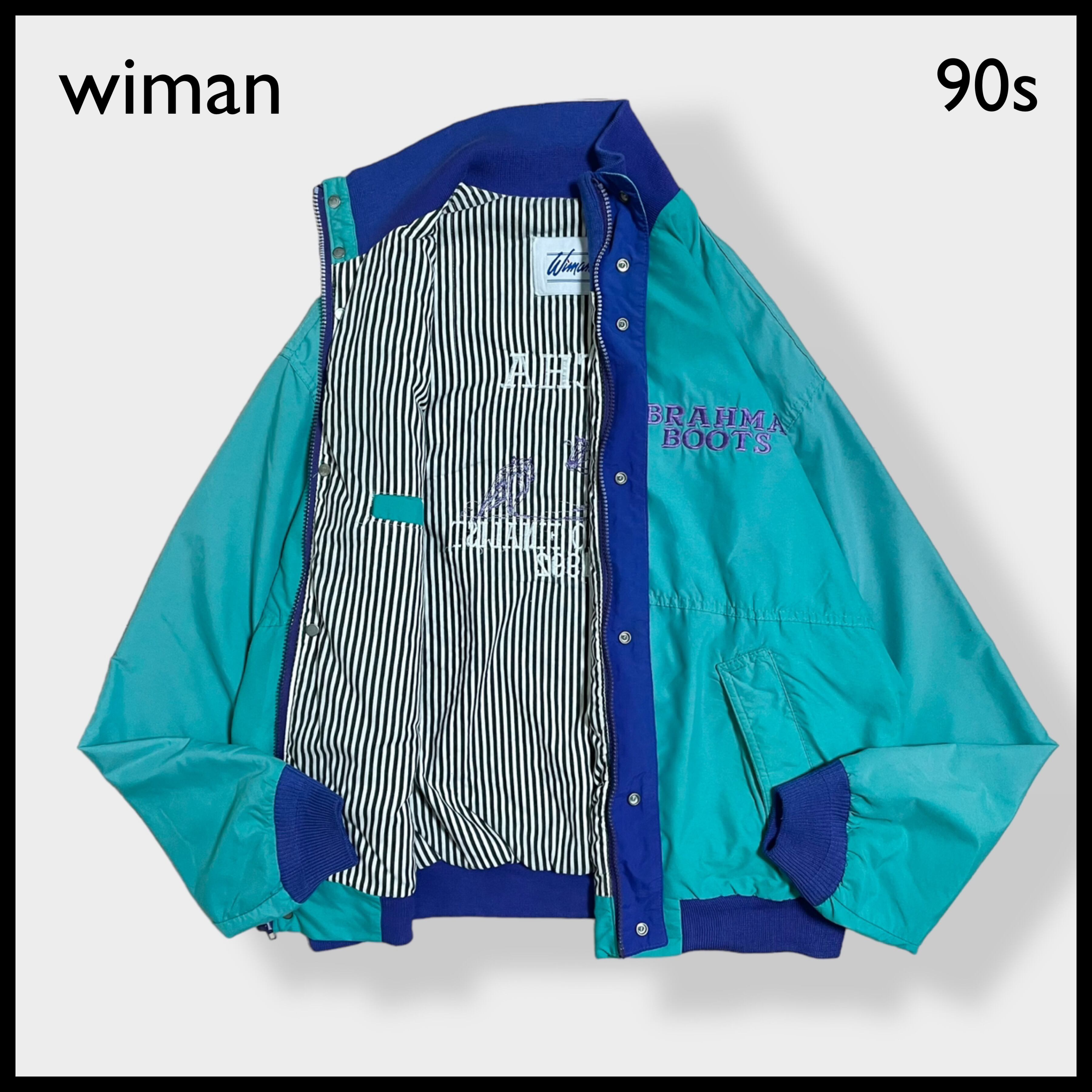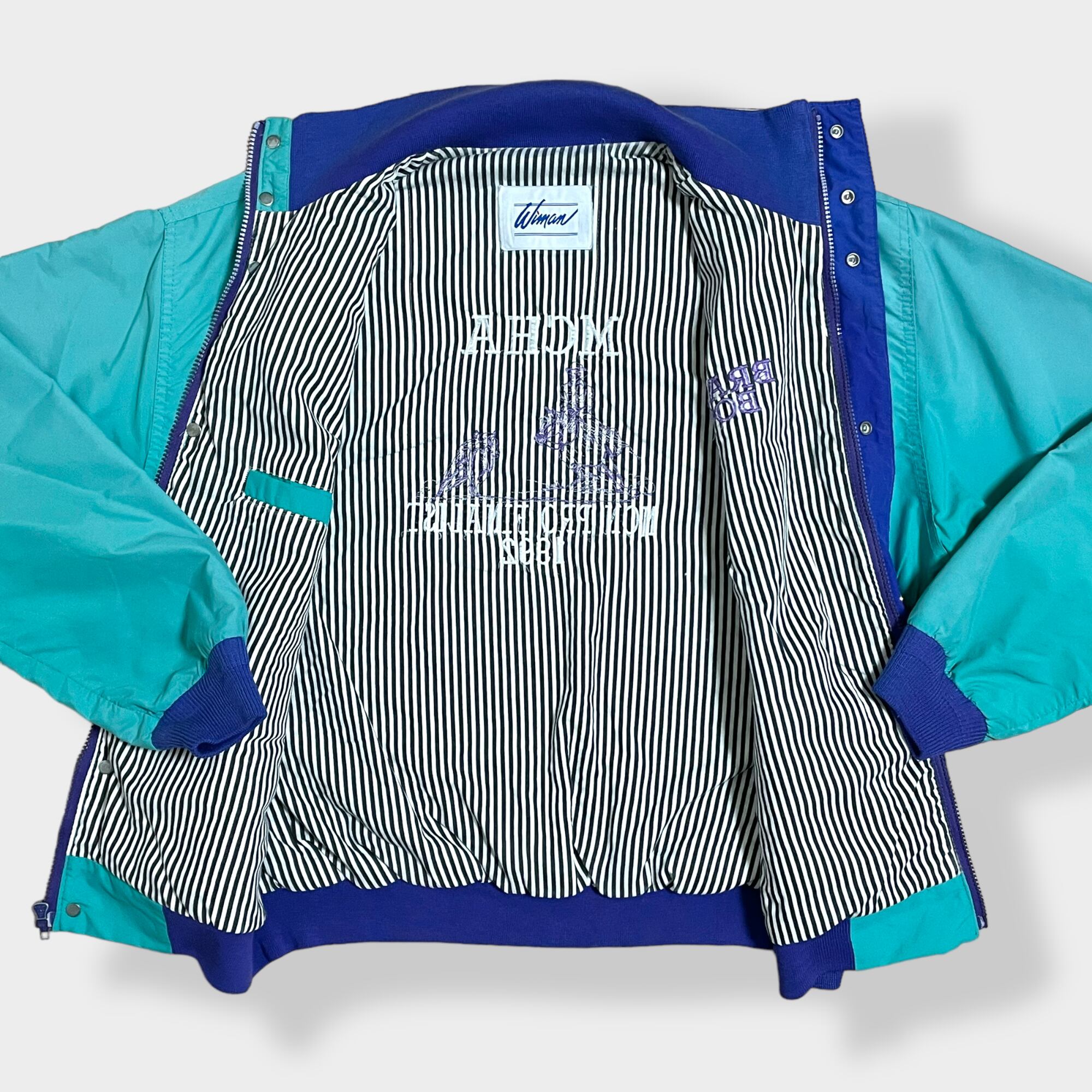 【wiman】 90s ブルゾン ジャケット ジャンパー フルジップ スナップ 刺繍 バックロゴ ストライプ ワンポイントロゴ エメラルドグリーン 切替 US古着