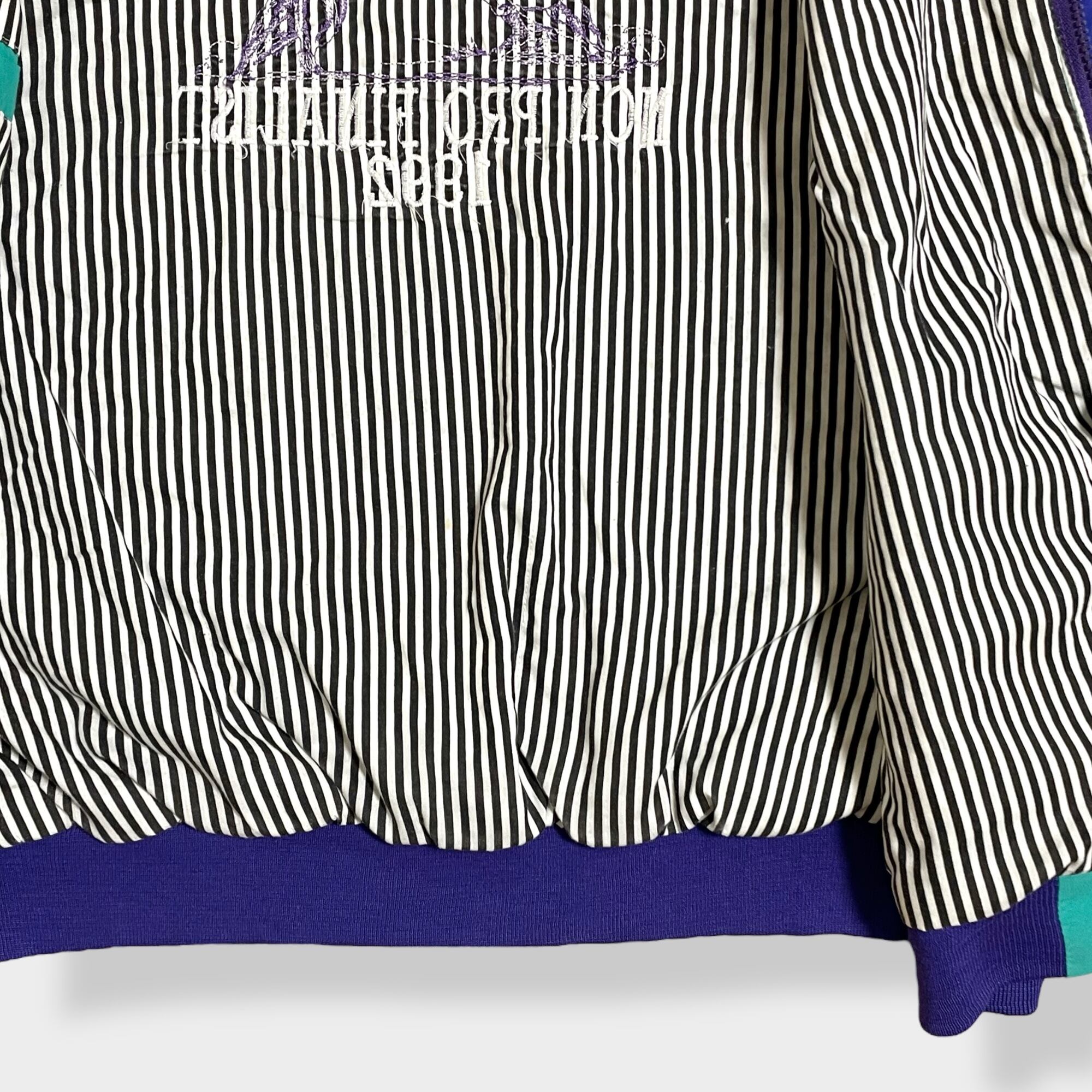 リブはパープル、前身頃はジッパーとスナップ、前身頃ポケット×2、裏地はストライプ柄、レトロな雰囲気でオシャレな一着です。