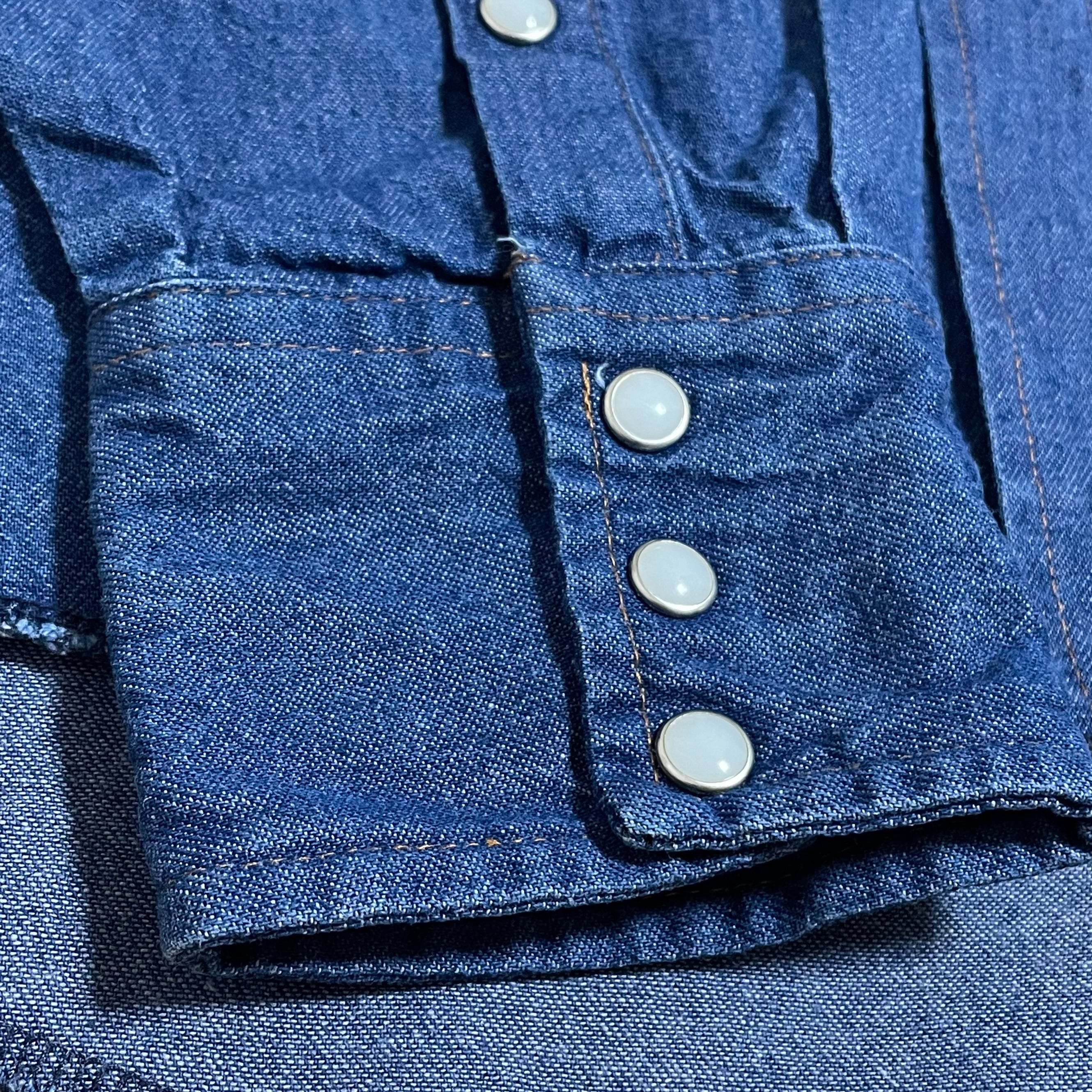スナップボタン、ショルダーヨーク、フラップポケット、ラウンドカット、ラングラーの定番で雰囲気抜群のディテールです。