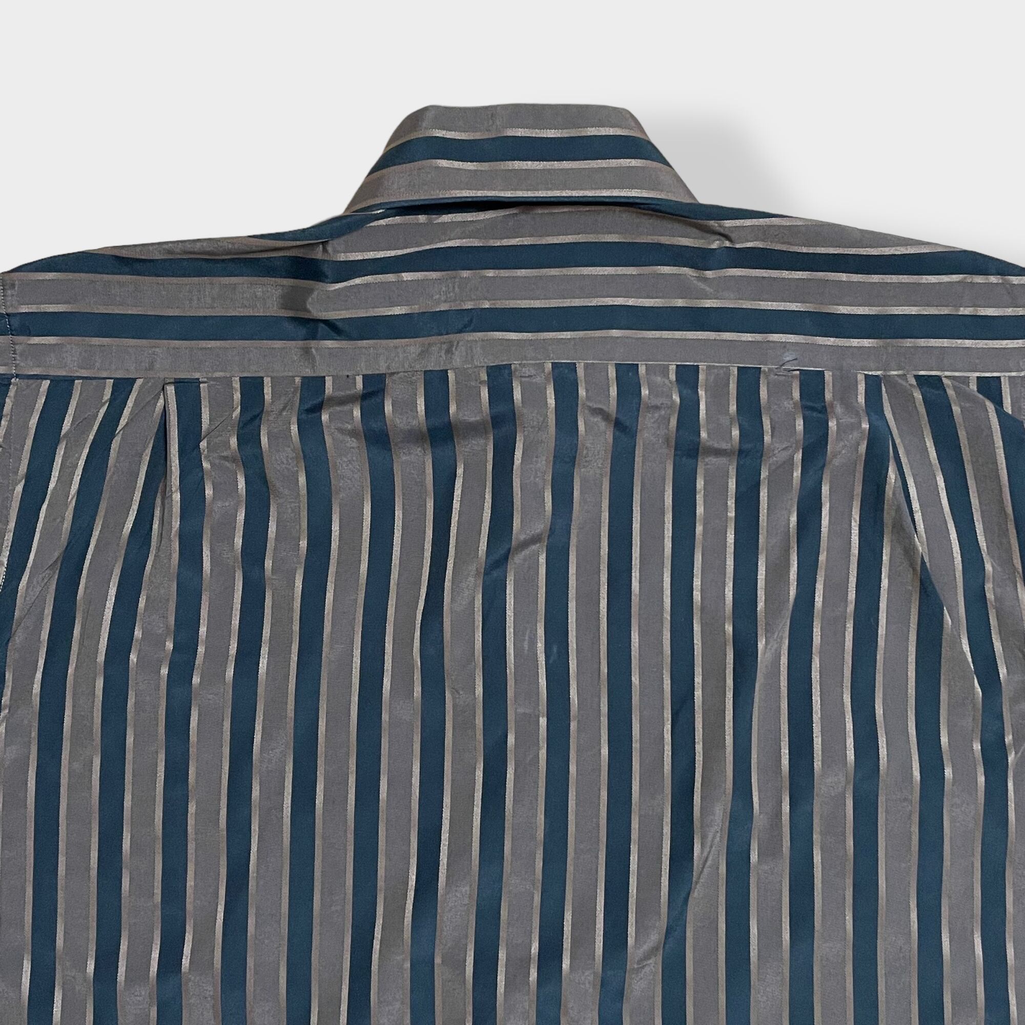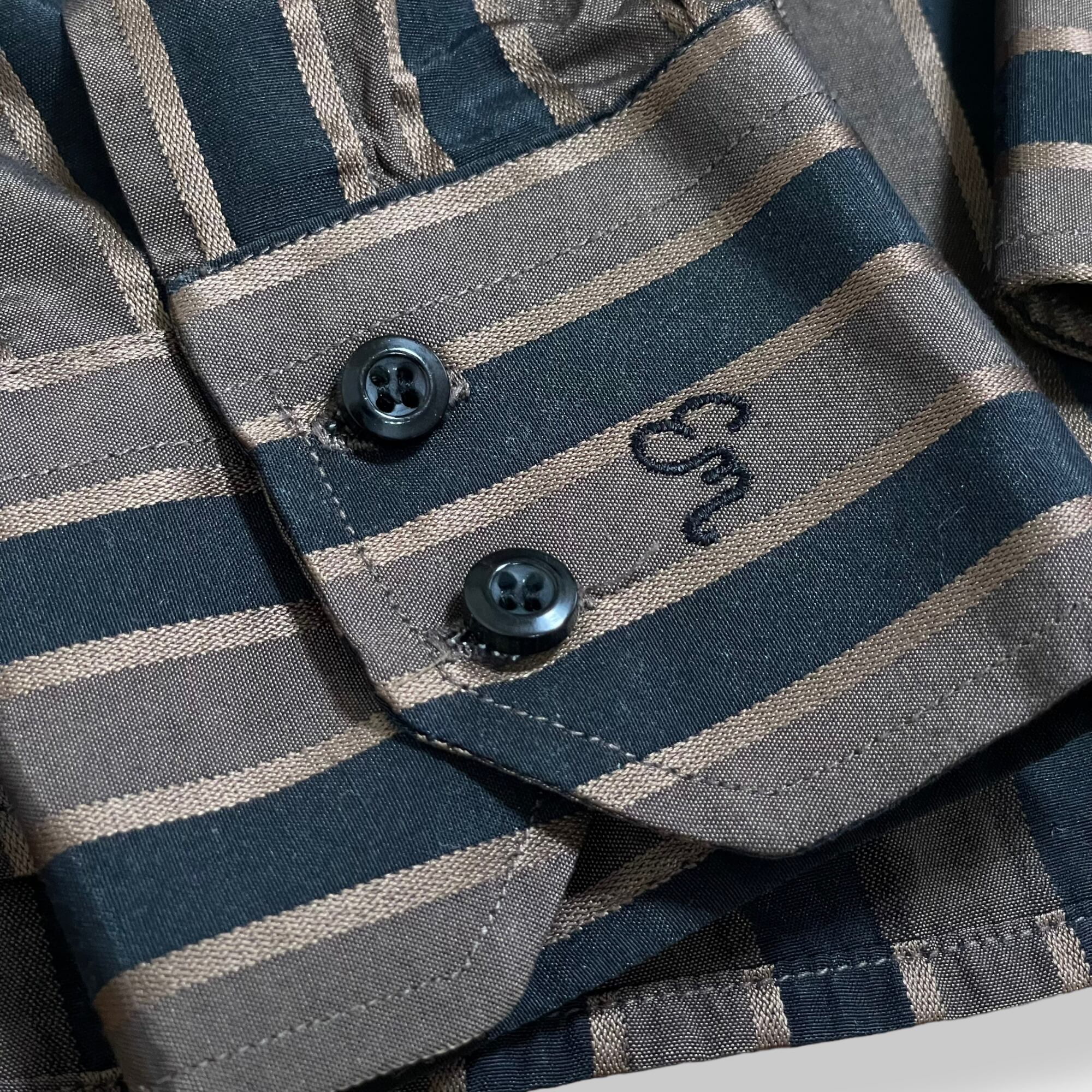 デカ襟で70sテイストのある一品。ブラウンとブラックのストライプ柄で光沢のあるボディ。