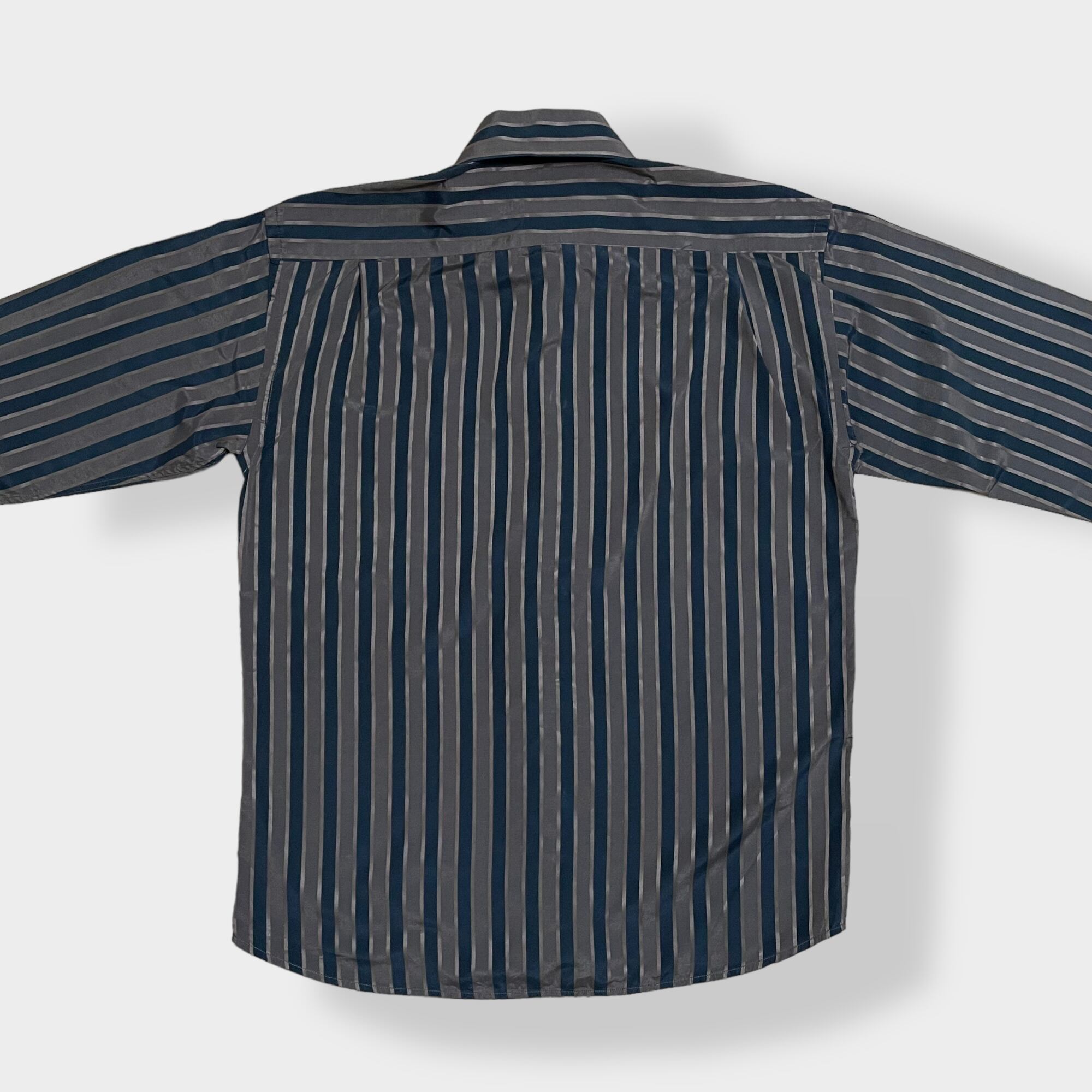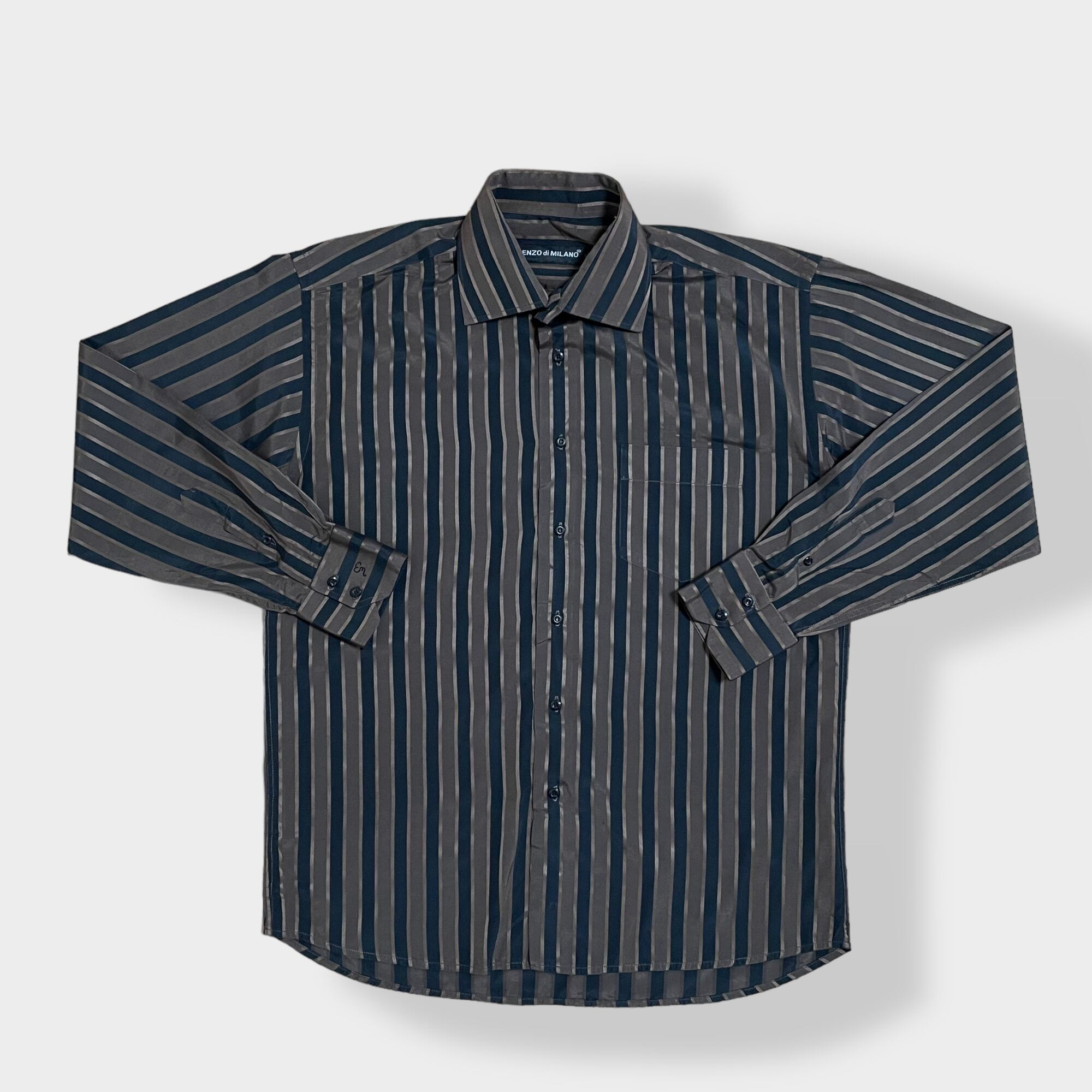 【ENZO di MILANO】デカ襟 70s風 刺繍ロゴ ストライプシャツ 長袖シャツ カジュアルシャツ ポリシャツ 茶 黒 柄シャツ レトロ L EU古着