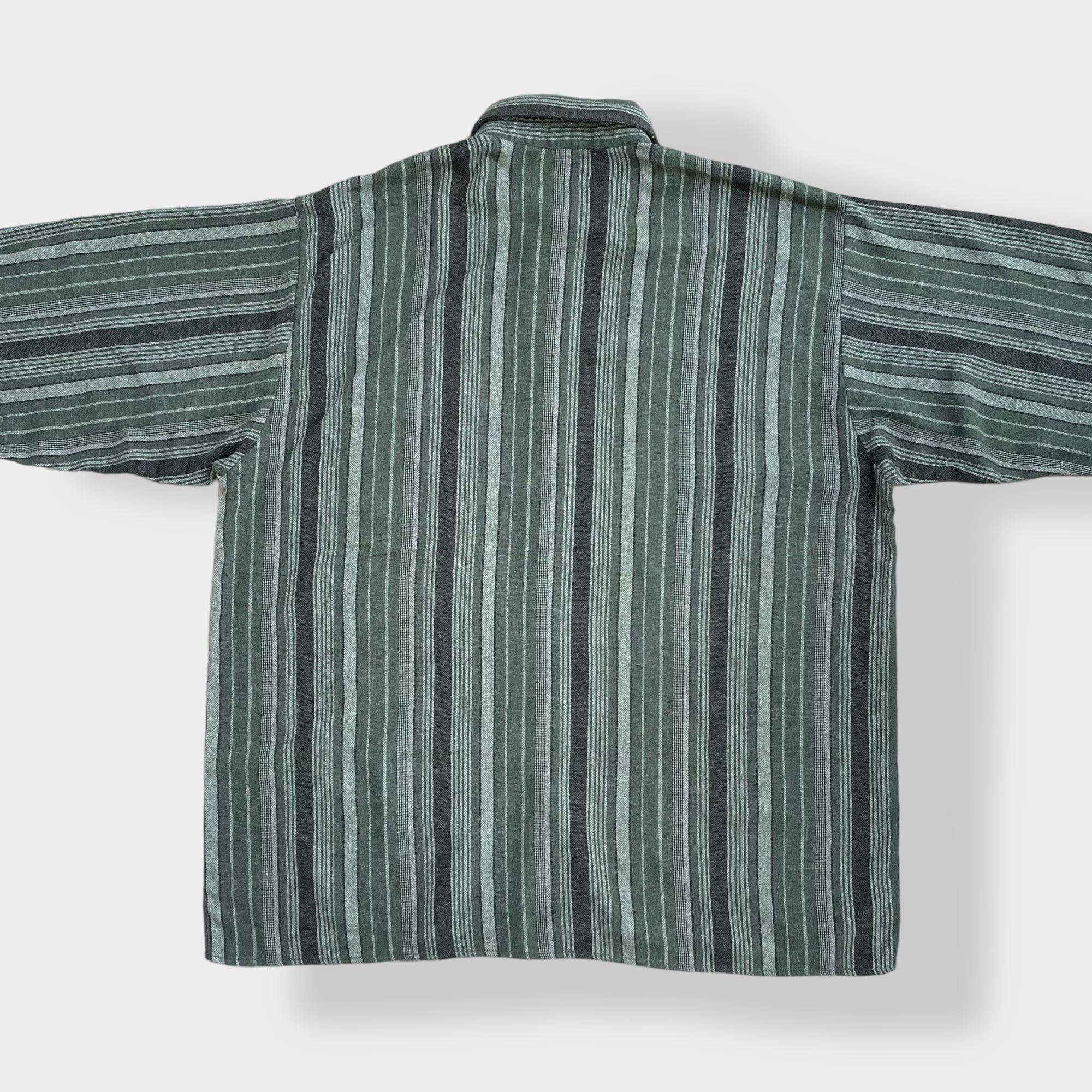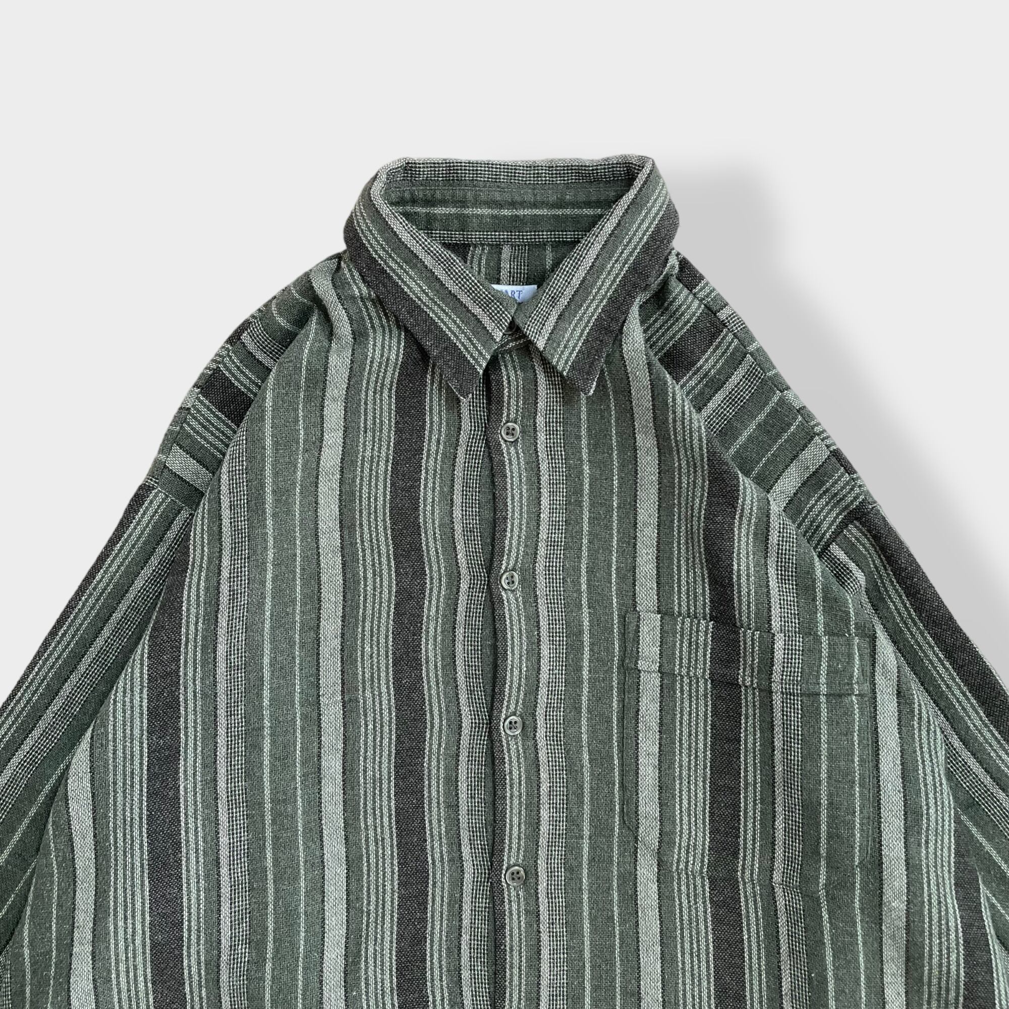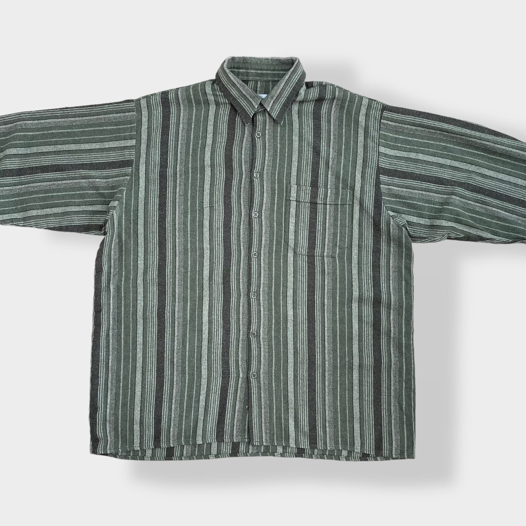 【DAMART】ストライプシャツ 長袖シャツ アースカラー グリーン系 マルチストライプ ウール コットン ブレンド素材 XL ビッグシルエット US古着