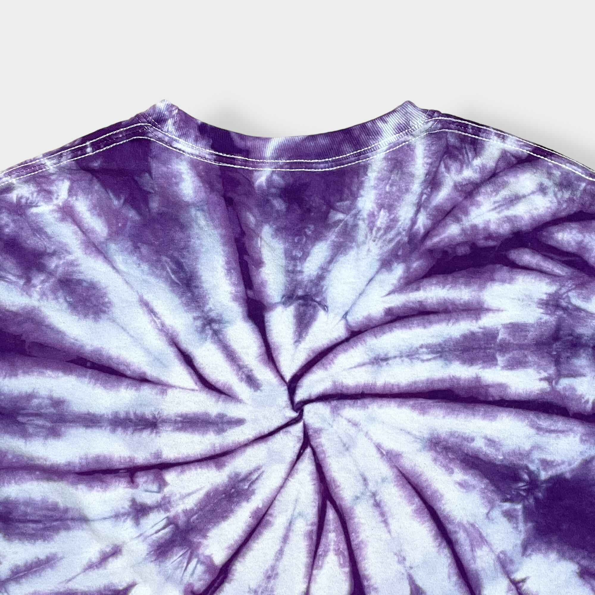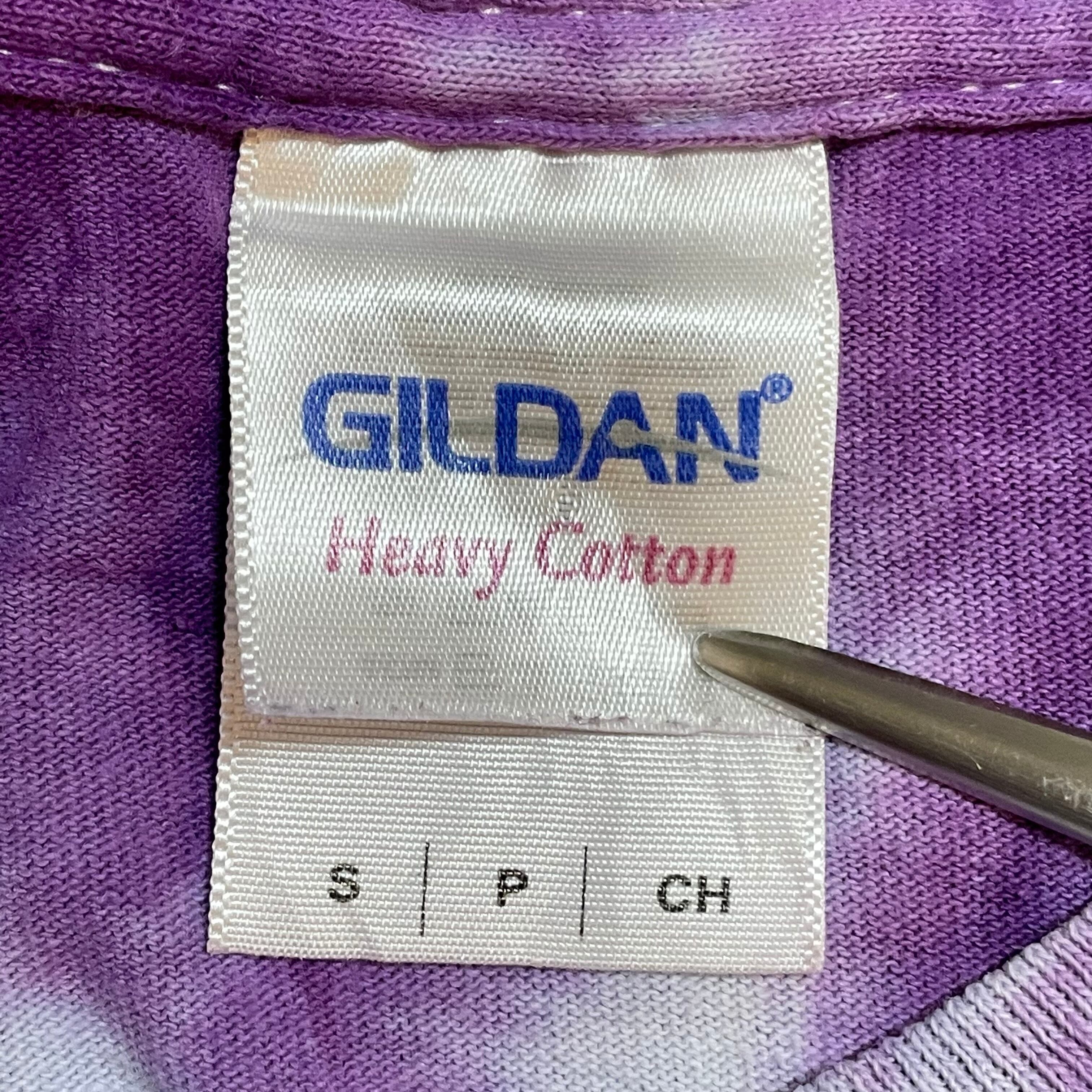 ボディはギルダン、パープルのタイダイ染、サイズはSです。下部に実寸を掲載しておりますのでご参考ください。