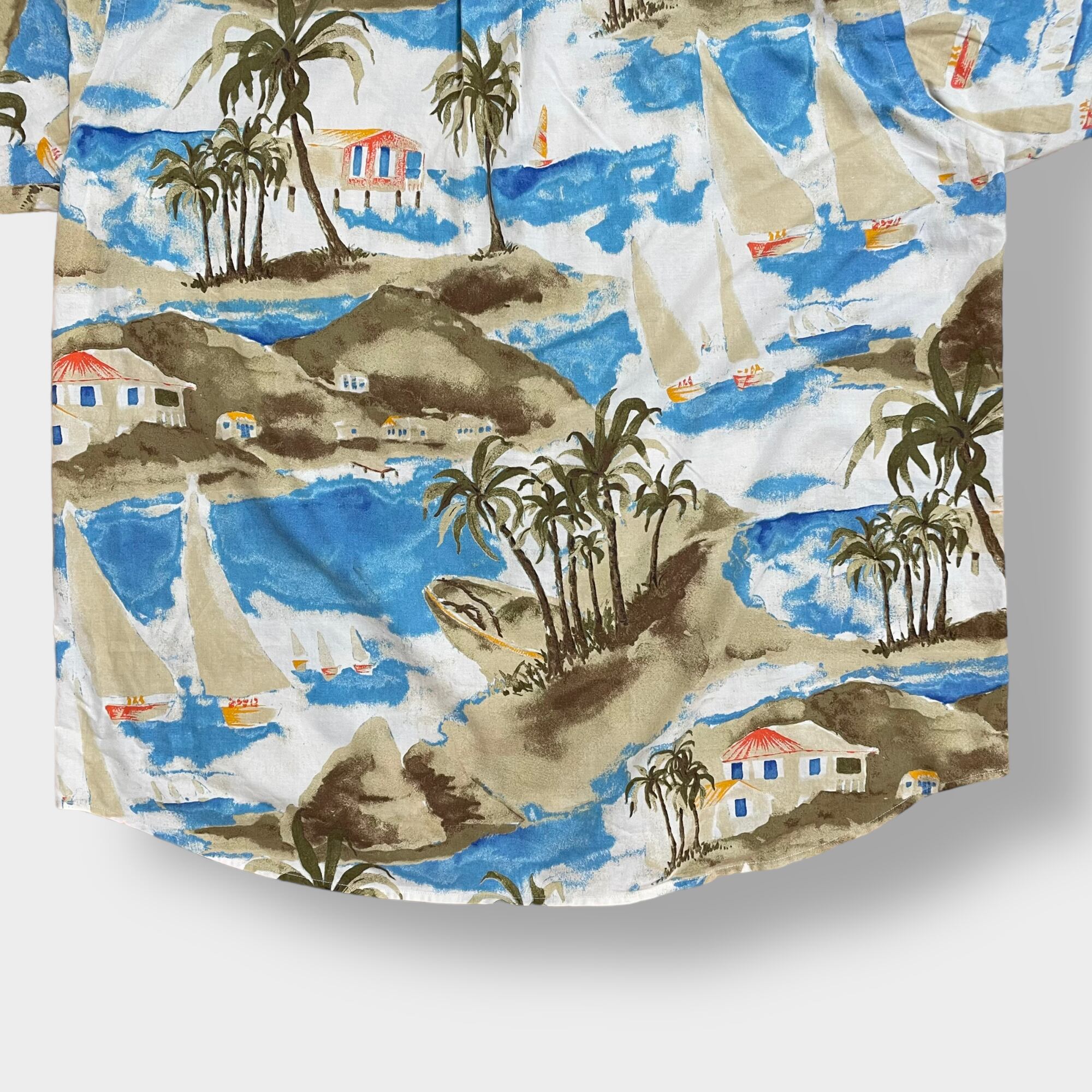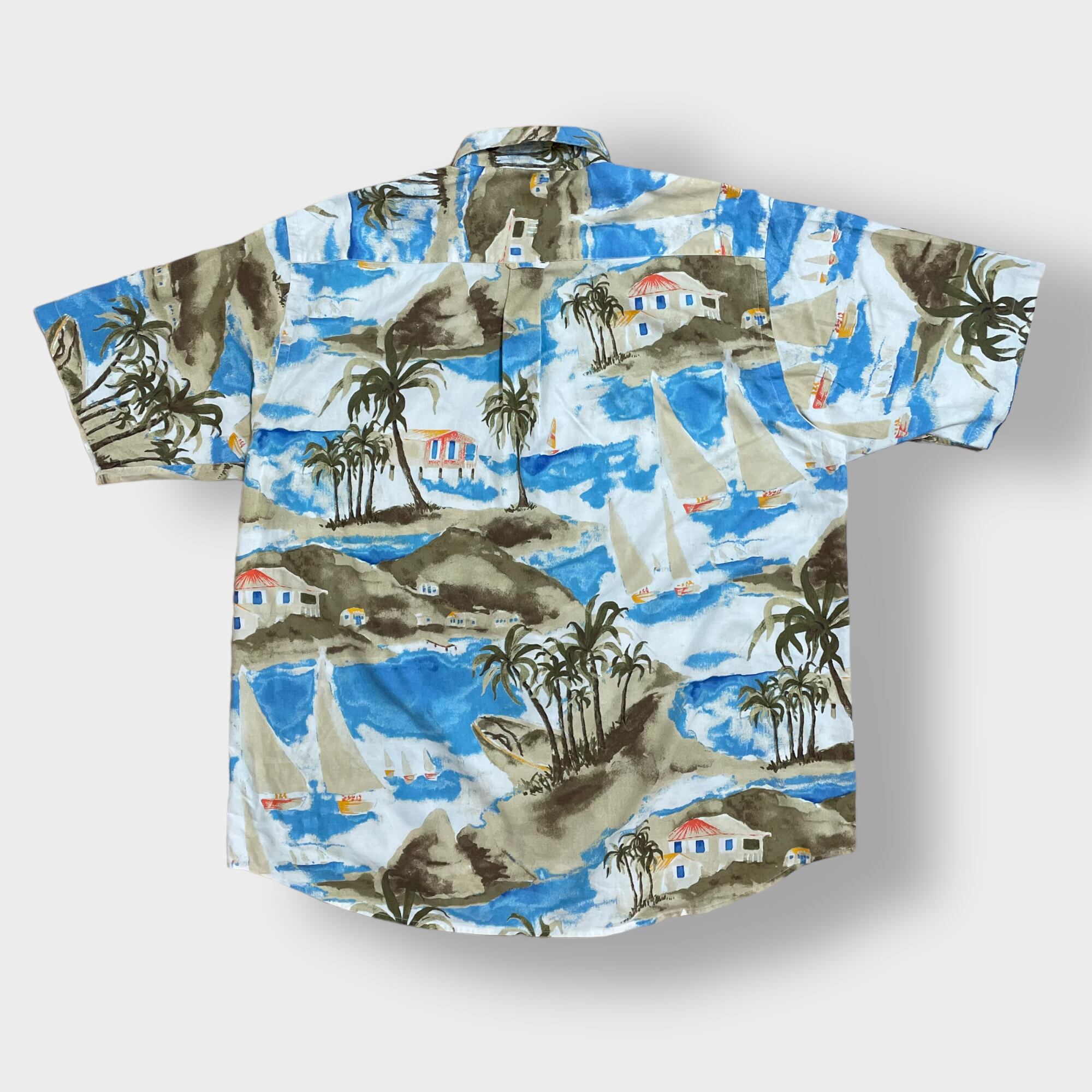 襟はボタンダウン、コットン素材、ヤシの木、海、ヨットなどをモチーフにしたオールパターンの爽やかな一着です。