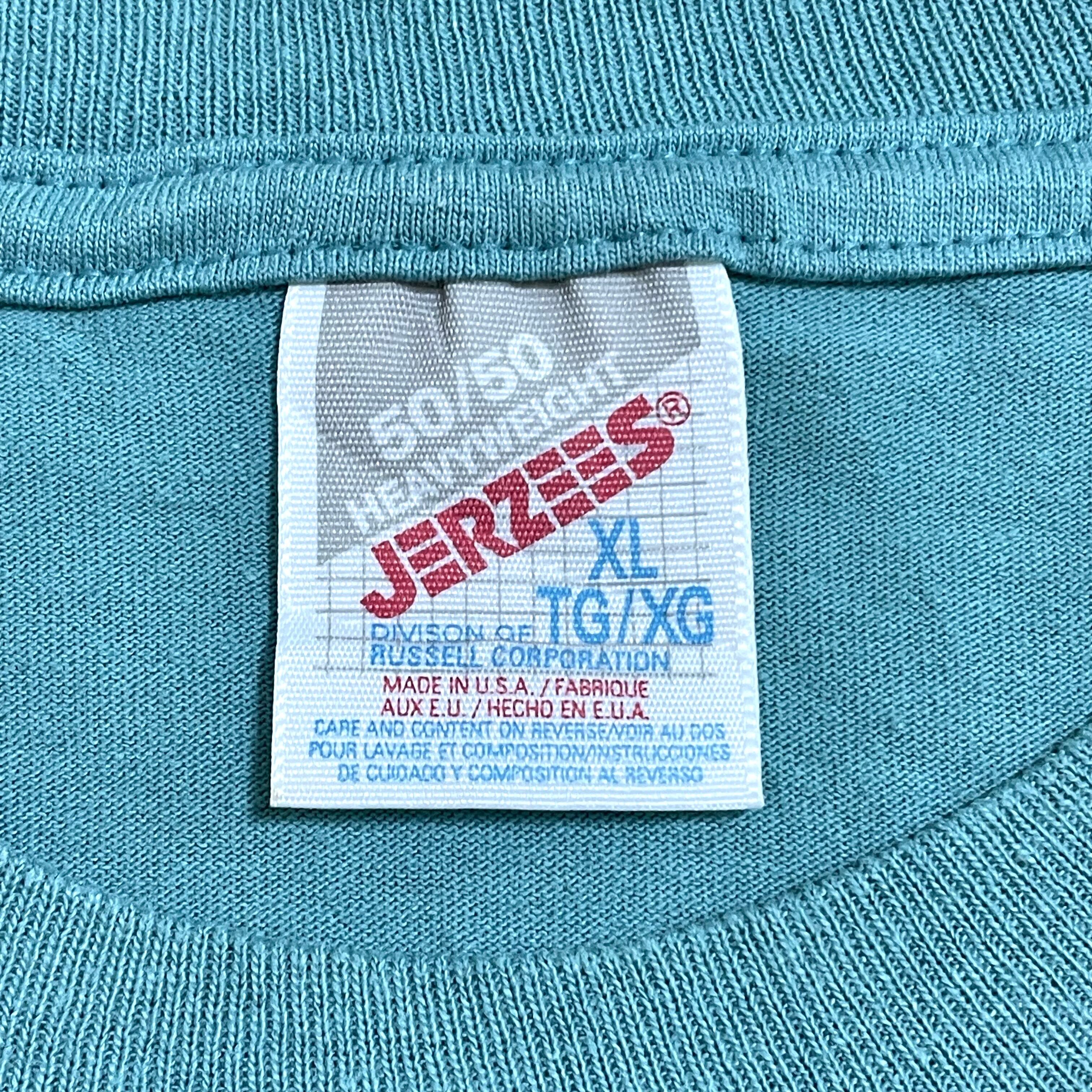 ボディはUSA製のJERZEES、まわしタグ、サイズ表記はXLのビッグサイズです。実寸は下部に掲載しておりますのでご参考ください。