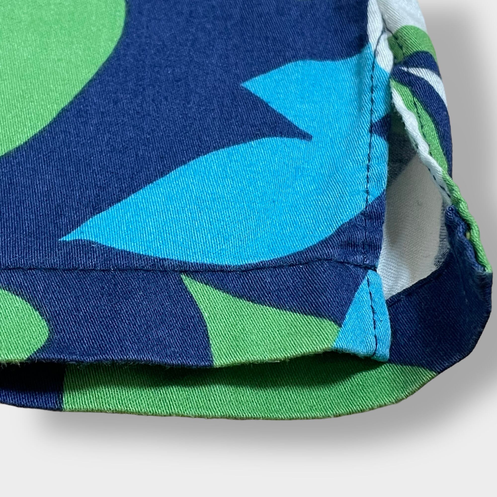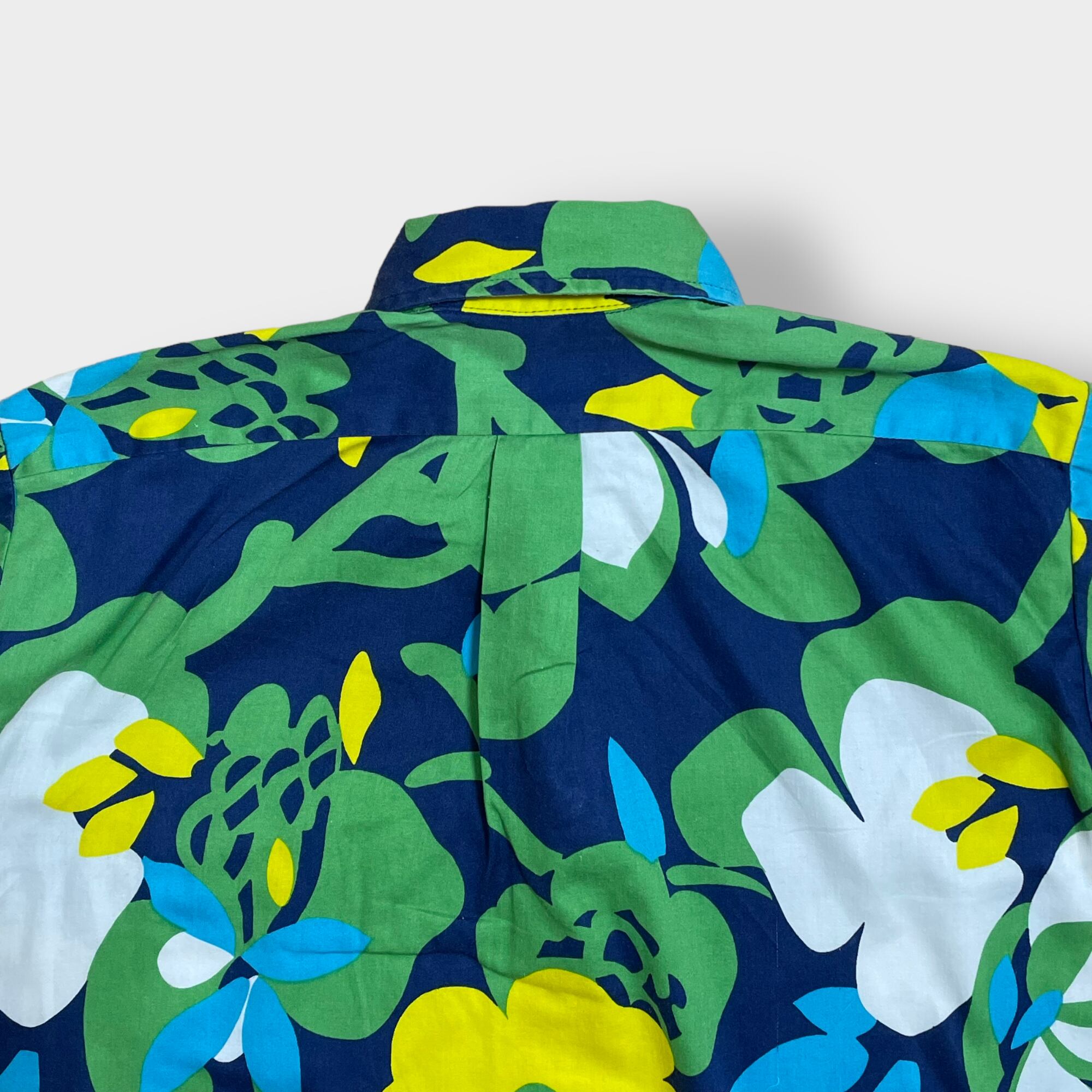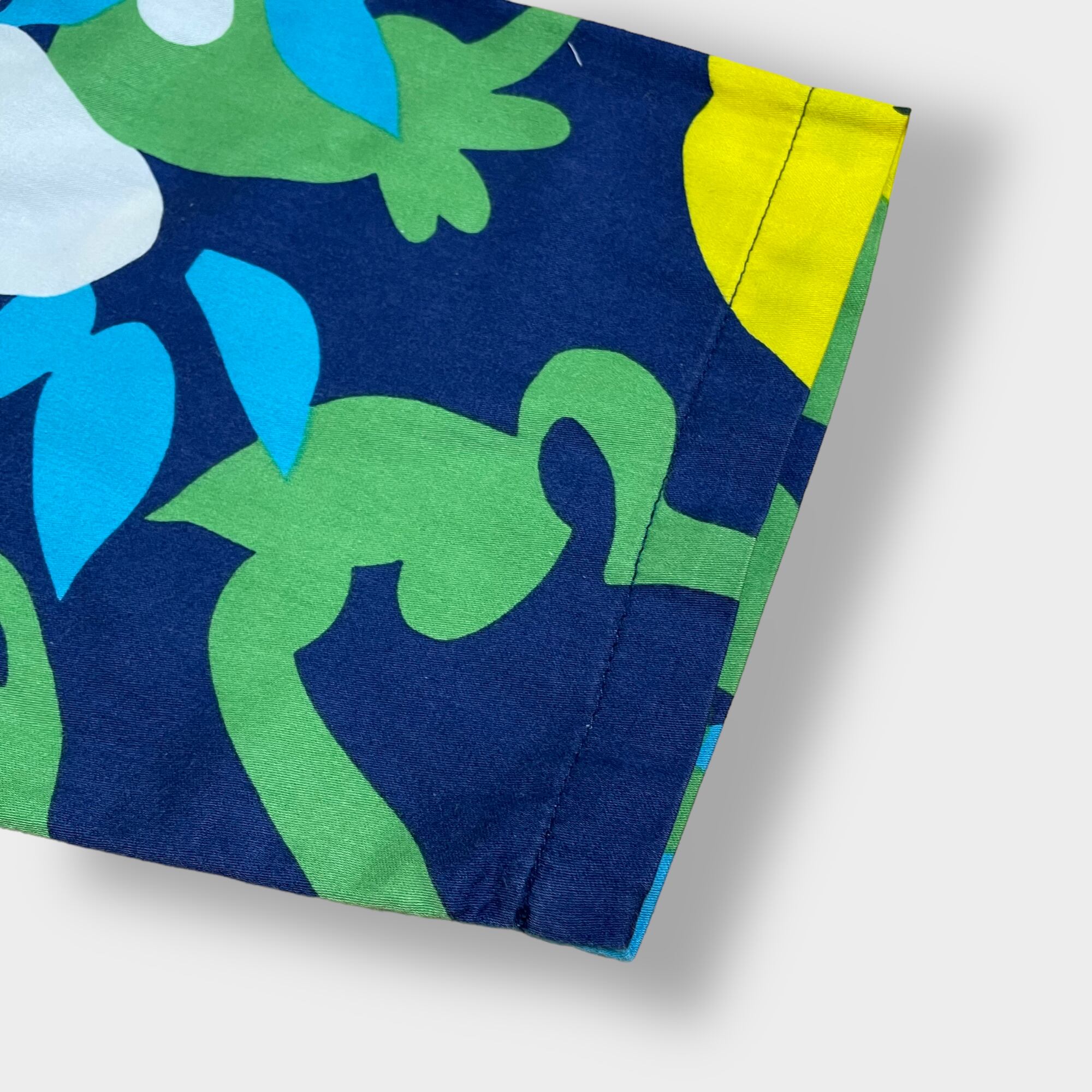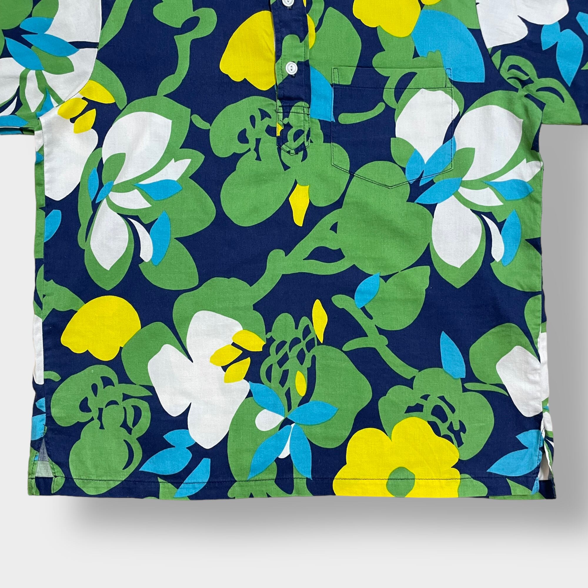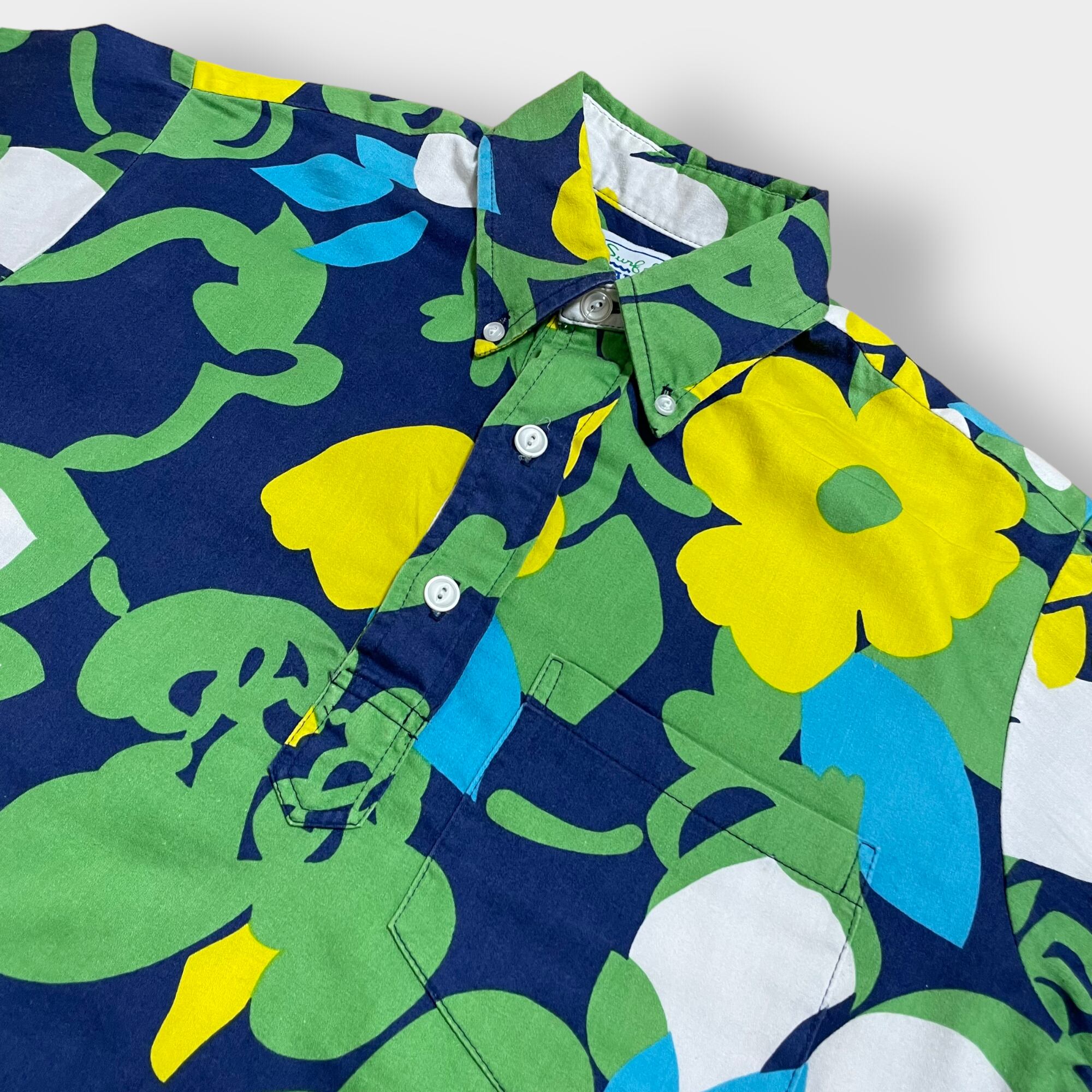 鮮やかなフラワーとリーフ柄のボディ、アロハには珍しいボタンダウンのハーフボタン、袖裾ともにシングルステッチ、胸ポケット付き、80年代〜90年代頃のUSA製です。