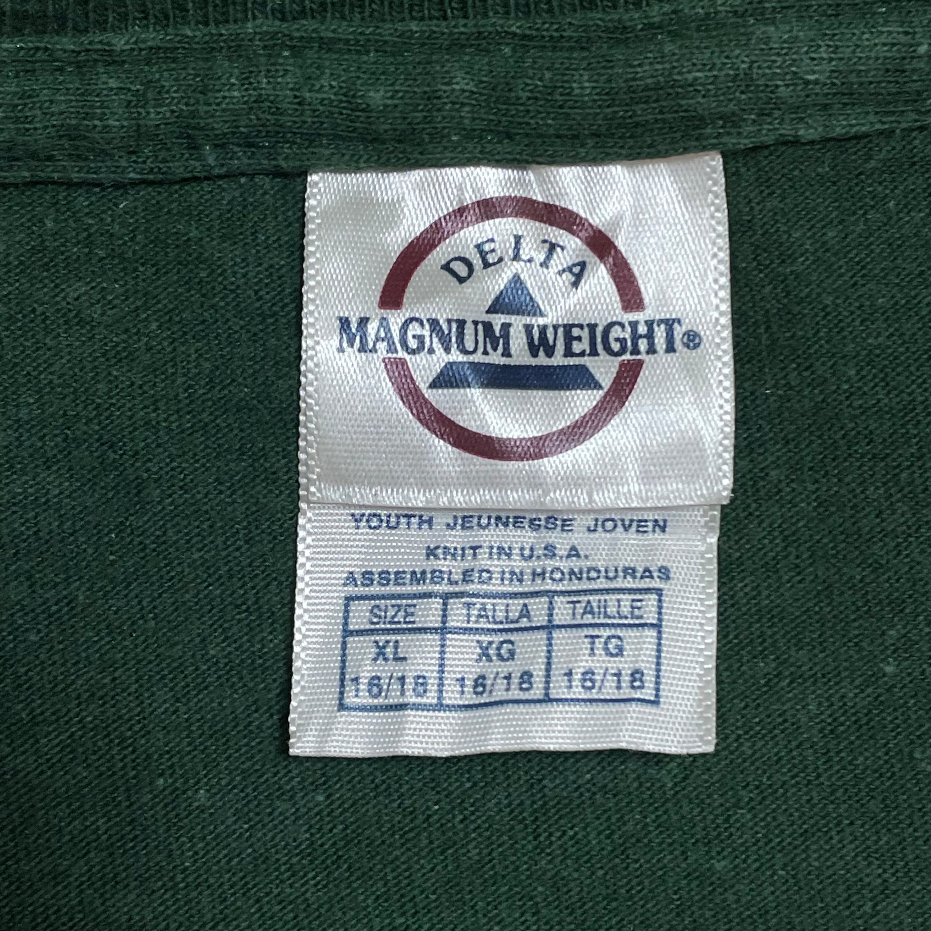 ボディはDELTAでUSA素材、サイズ表記はユースXL、サイズ感はメンズS〜M相当です。実寸を下部に掲載しておりますのでご参考ください。