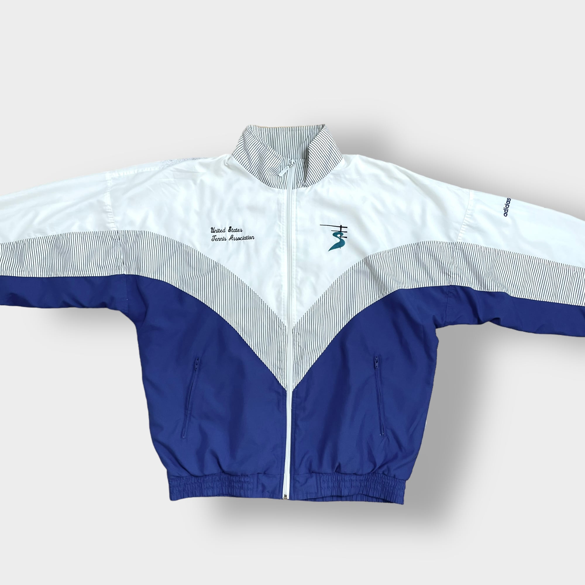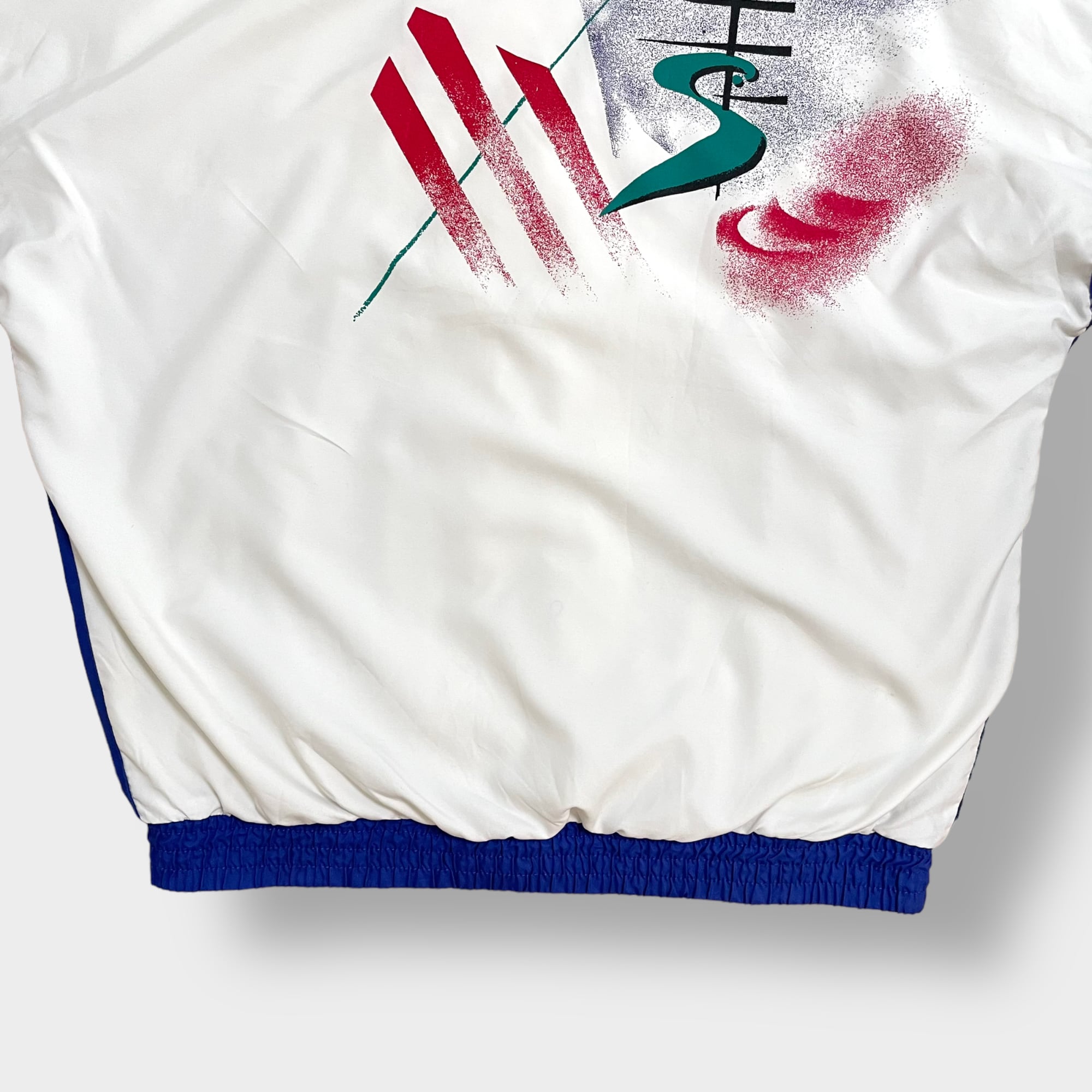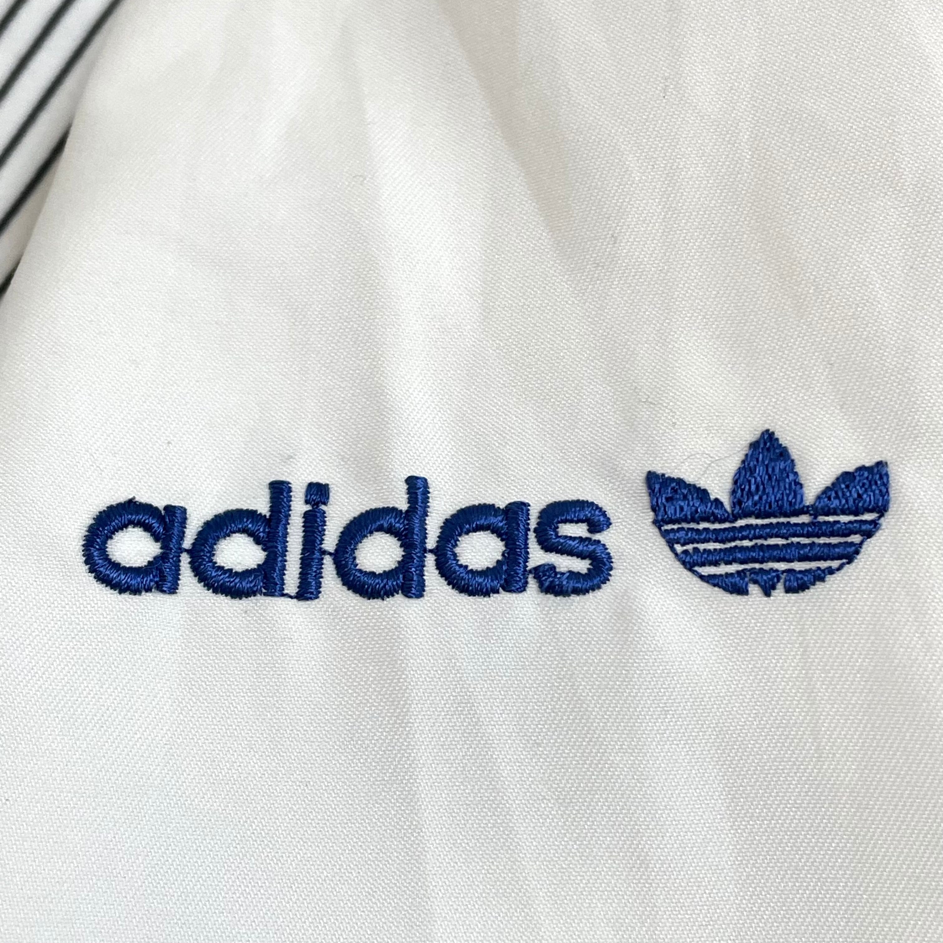 左右の胸にそれぞれ刺繍ロゴ、左袖にadidasの刺繍、バックプリント入り、銀タグ、万国旗タグの90sです。