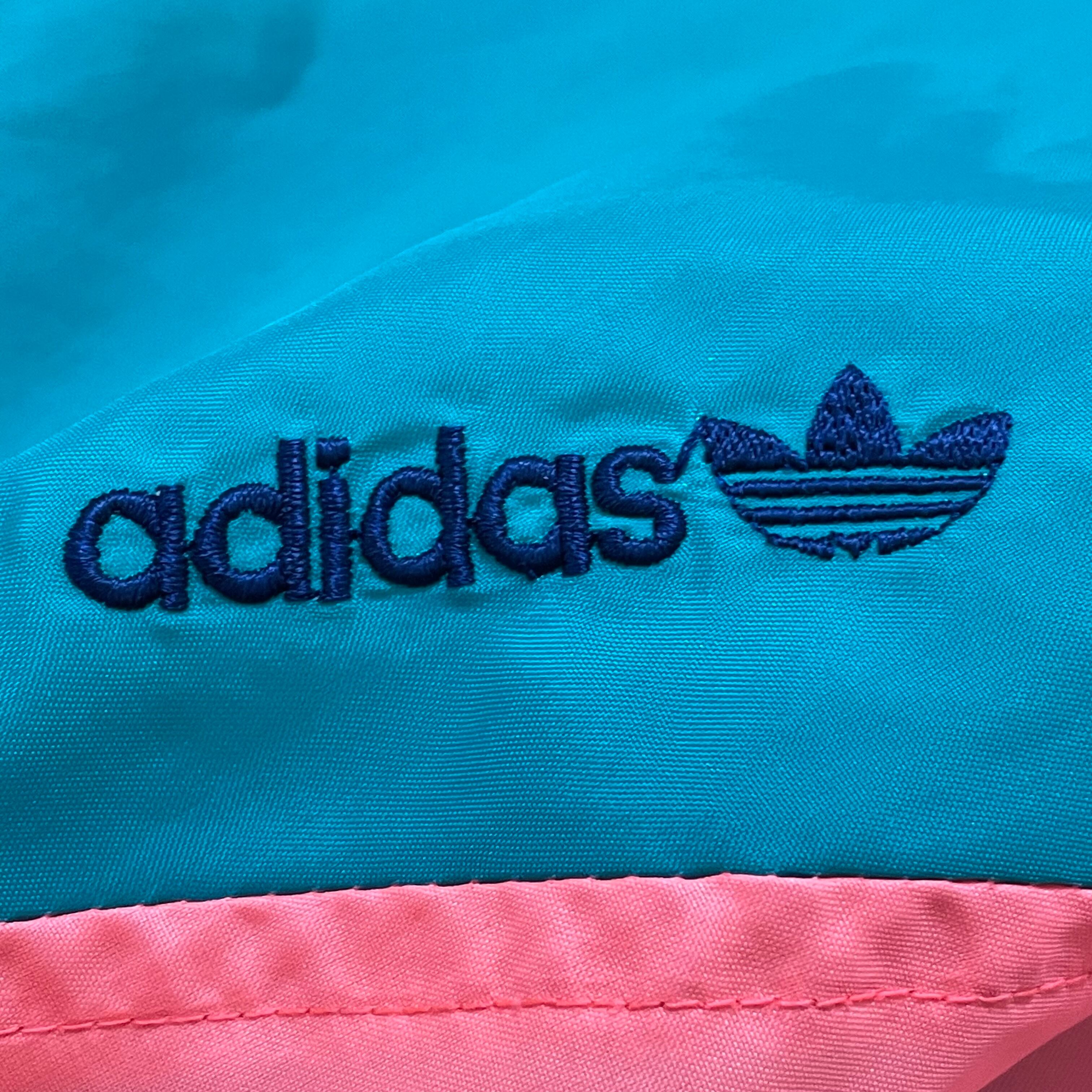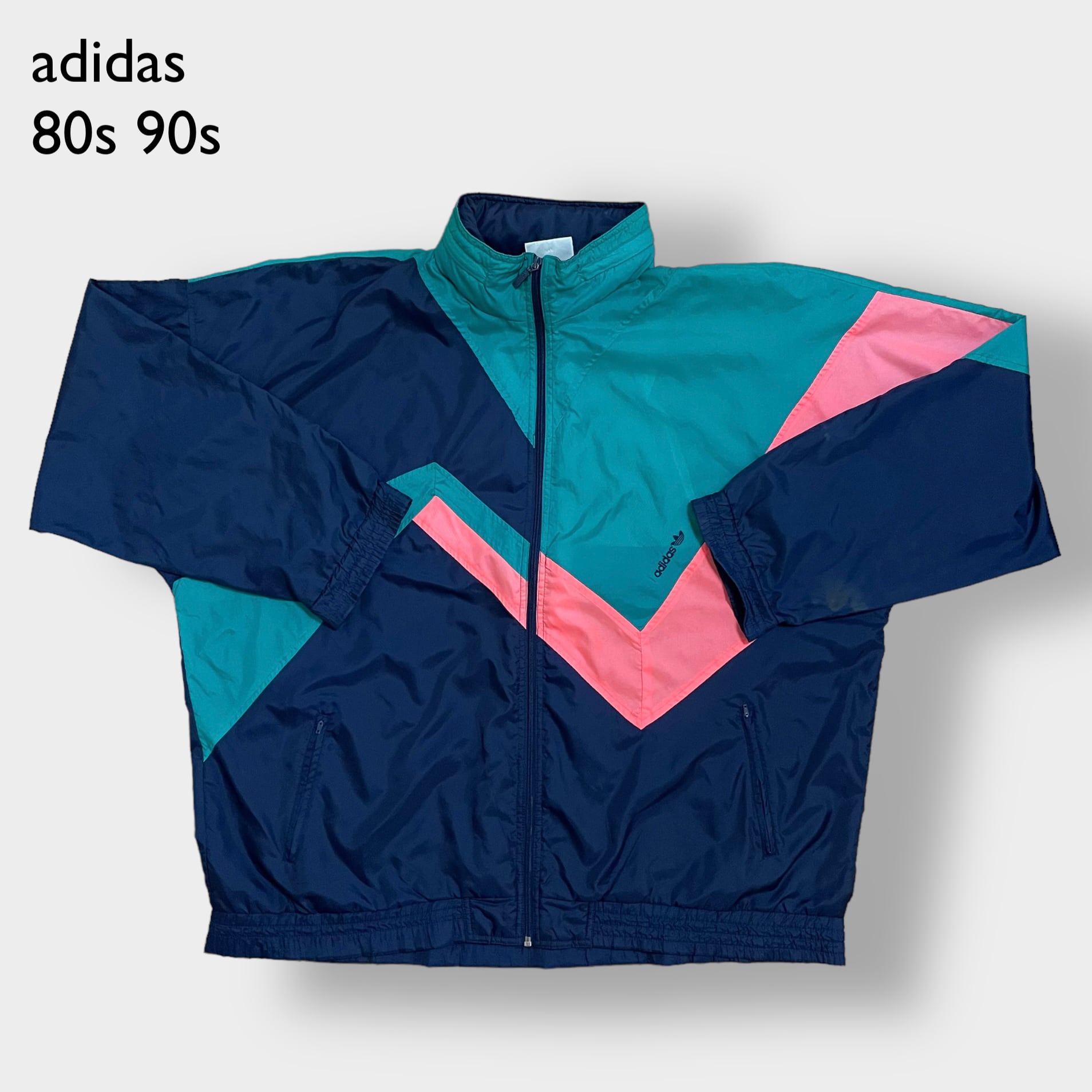 左胸にadidasの刺繍ロゴ、マルチカラーの切替ボディ、銀タグ、万国旗タグ、80s〜90sです。