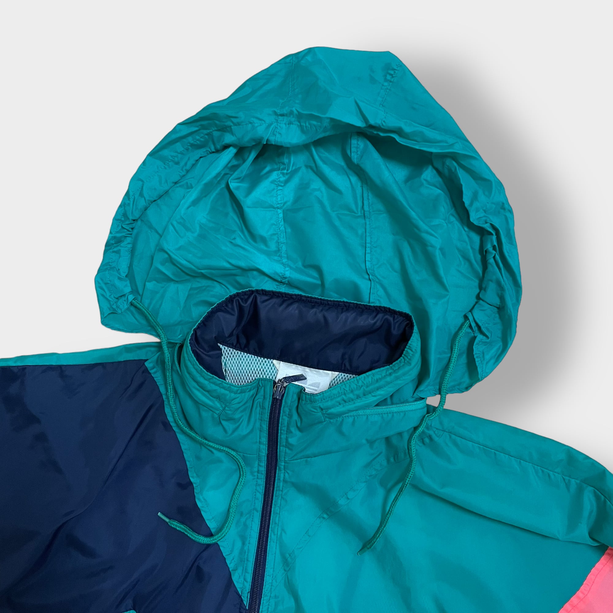 【adidas】80s 90s ジャケット ジャンパー ブルゾン XL ビッグシルエット 刺繍ロゴ フルジップ フード付き マルチカラー 切替 銀タグ 万国旗タグ アディダス US古着