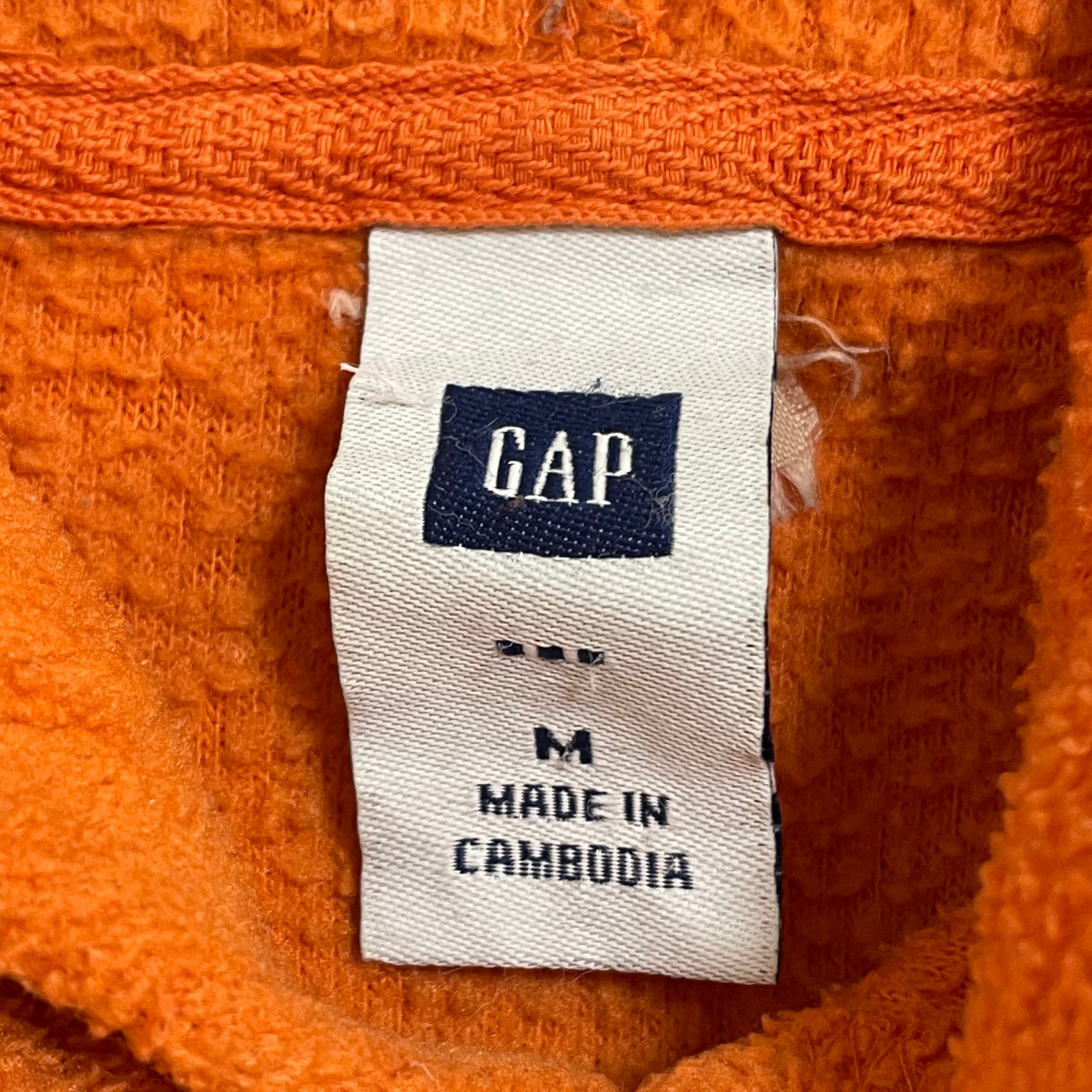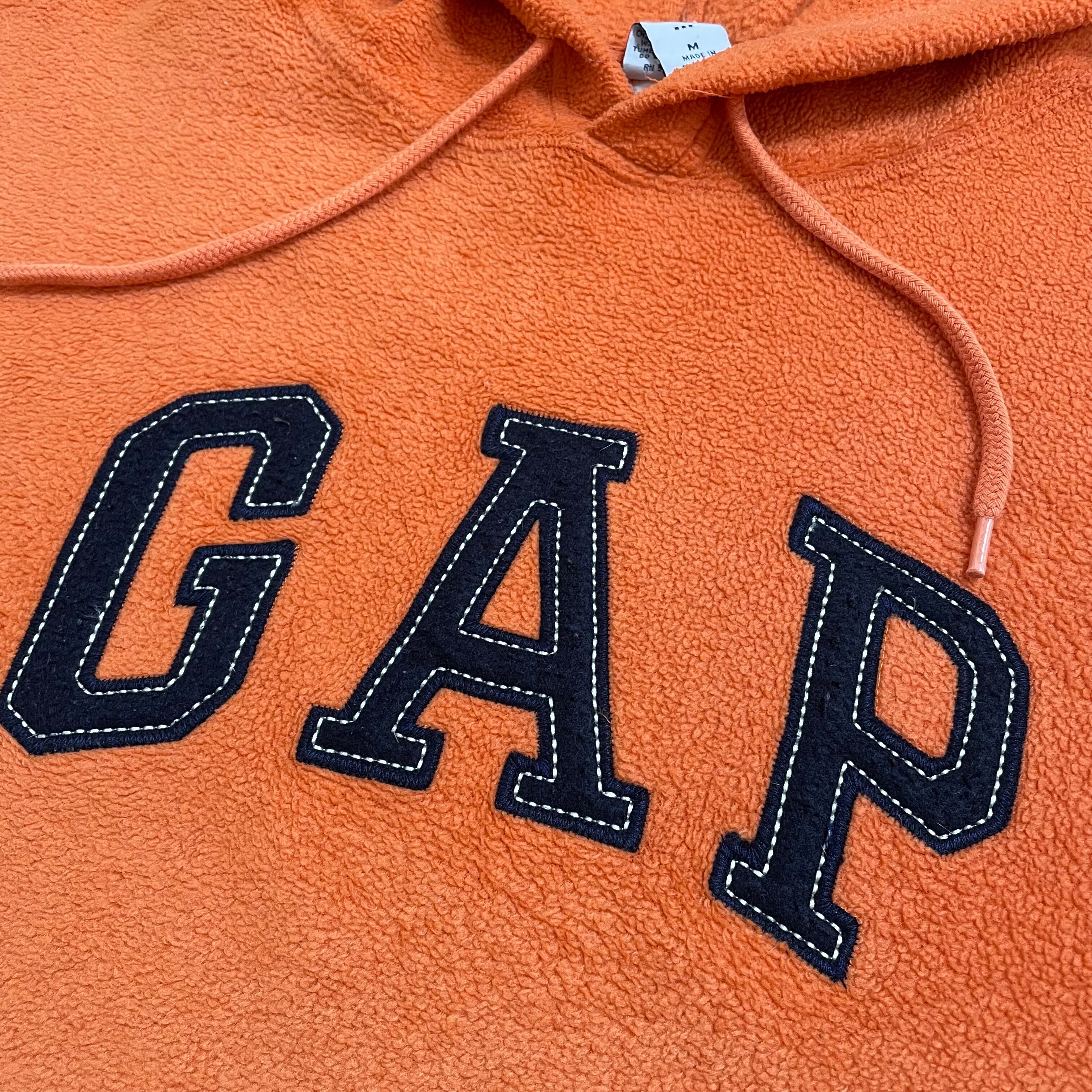 プルオーバー、オレンジボディ、裏表ともに起毛、胸にGAPの刺繍ロゴ入り。