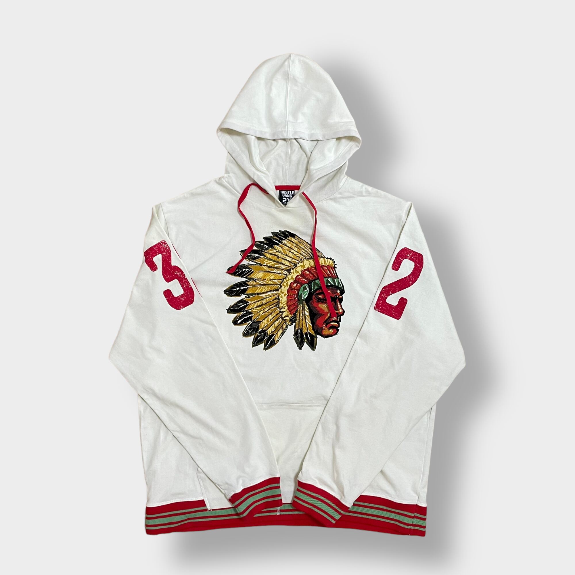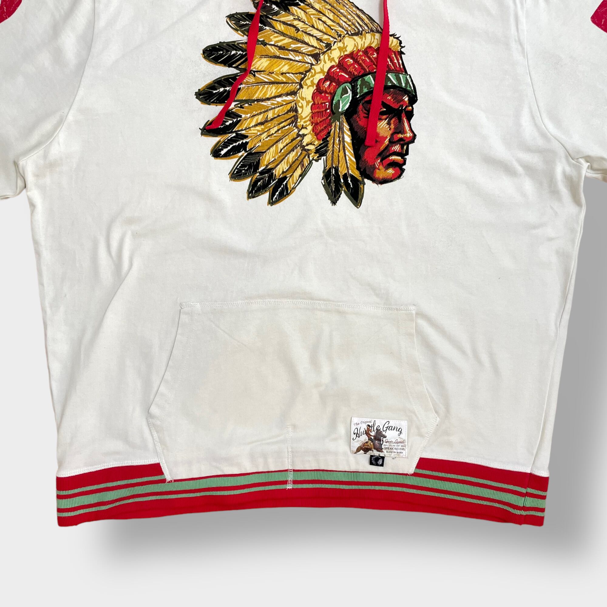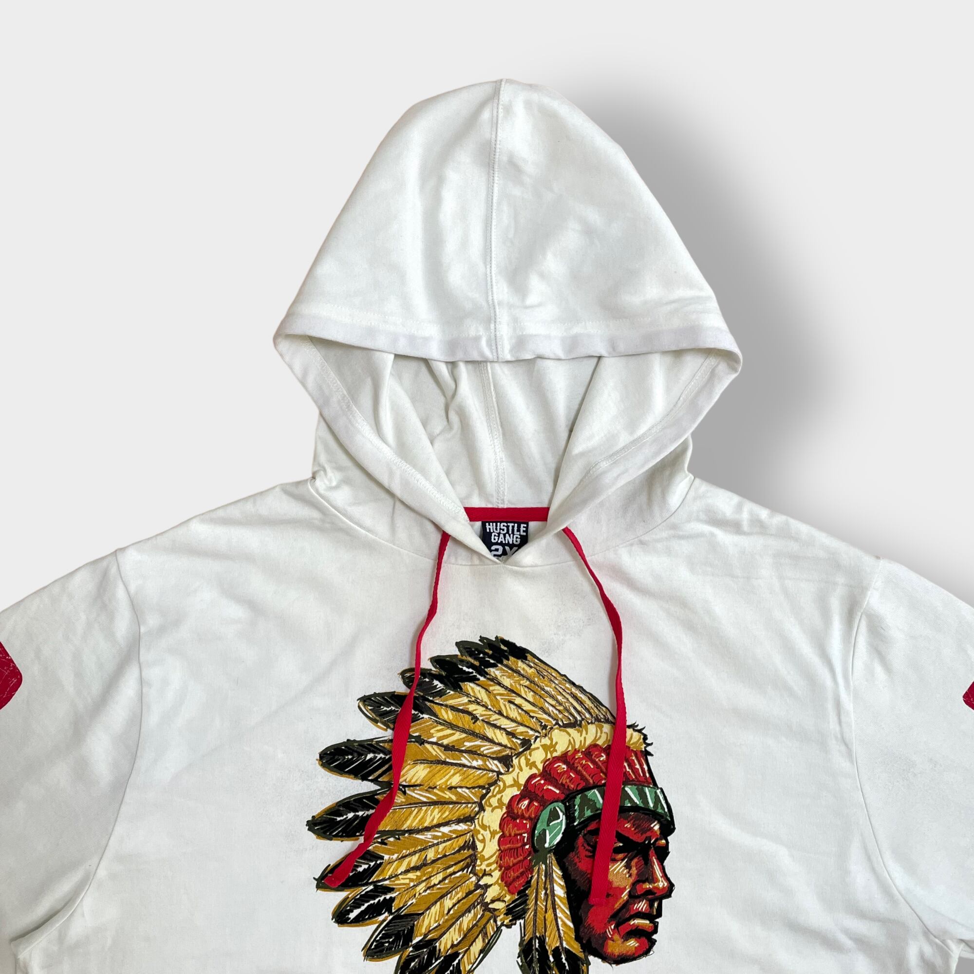 【HUSTLE GANG】パーカー プルオーバー インディアン プリント 袖ロゴ ラインリブ フーディー スウェット 2X ビッグサイズ US古着