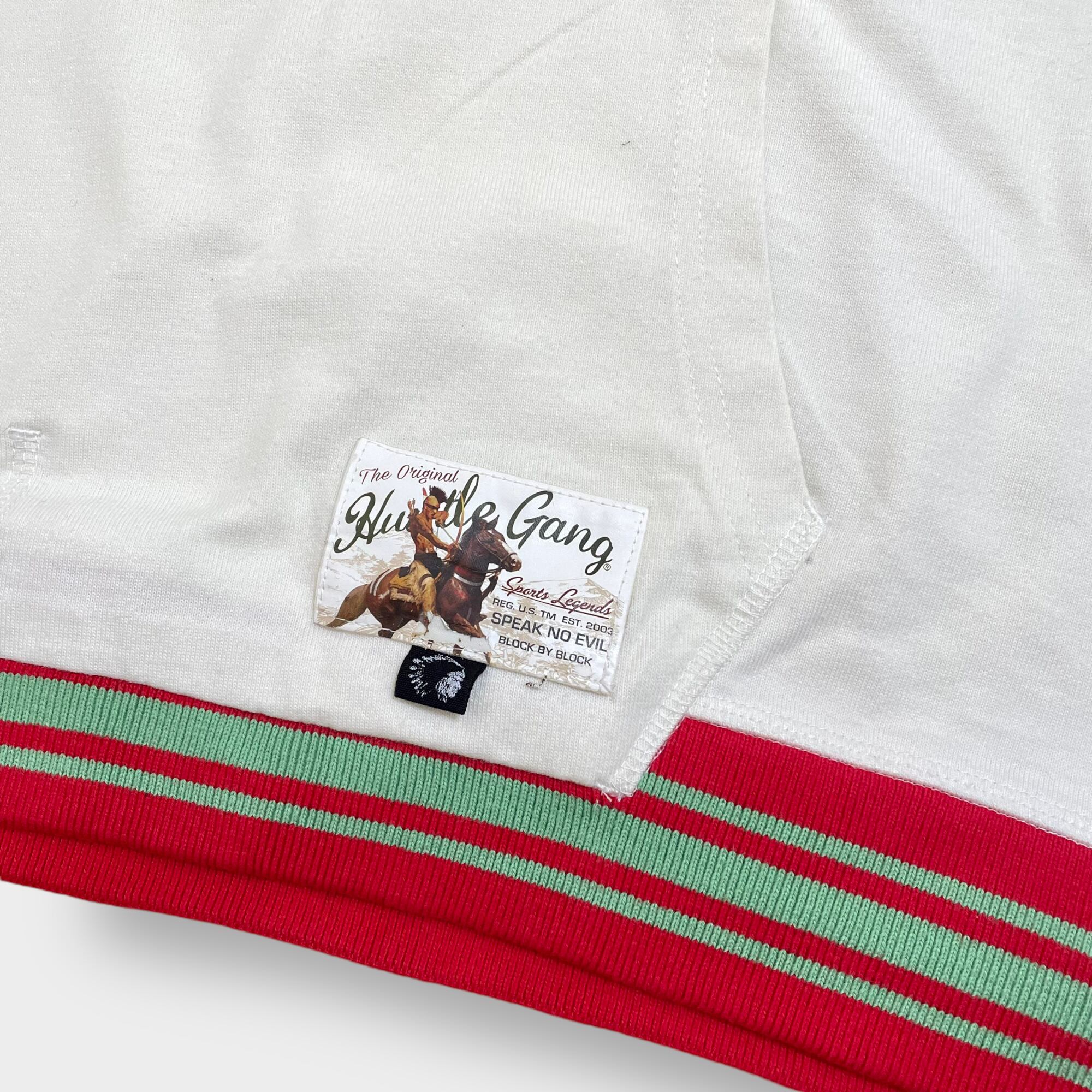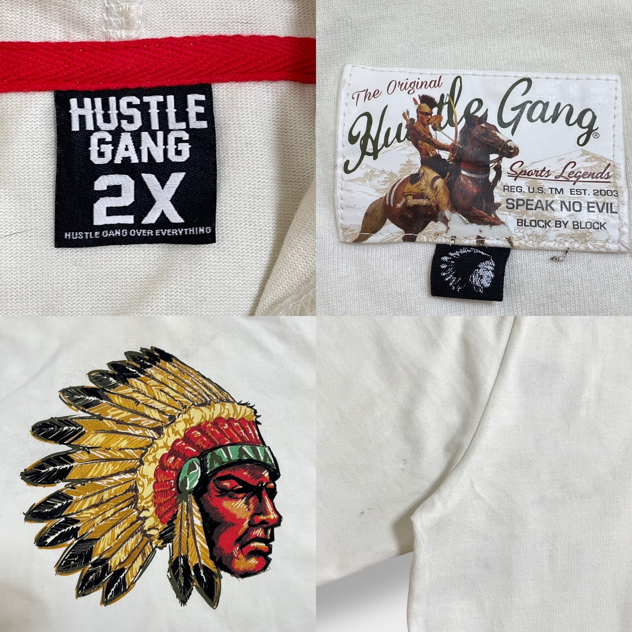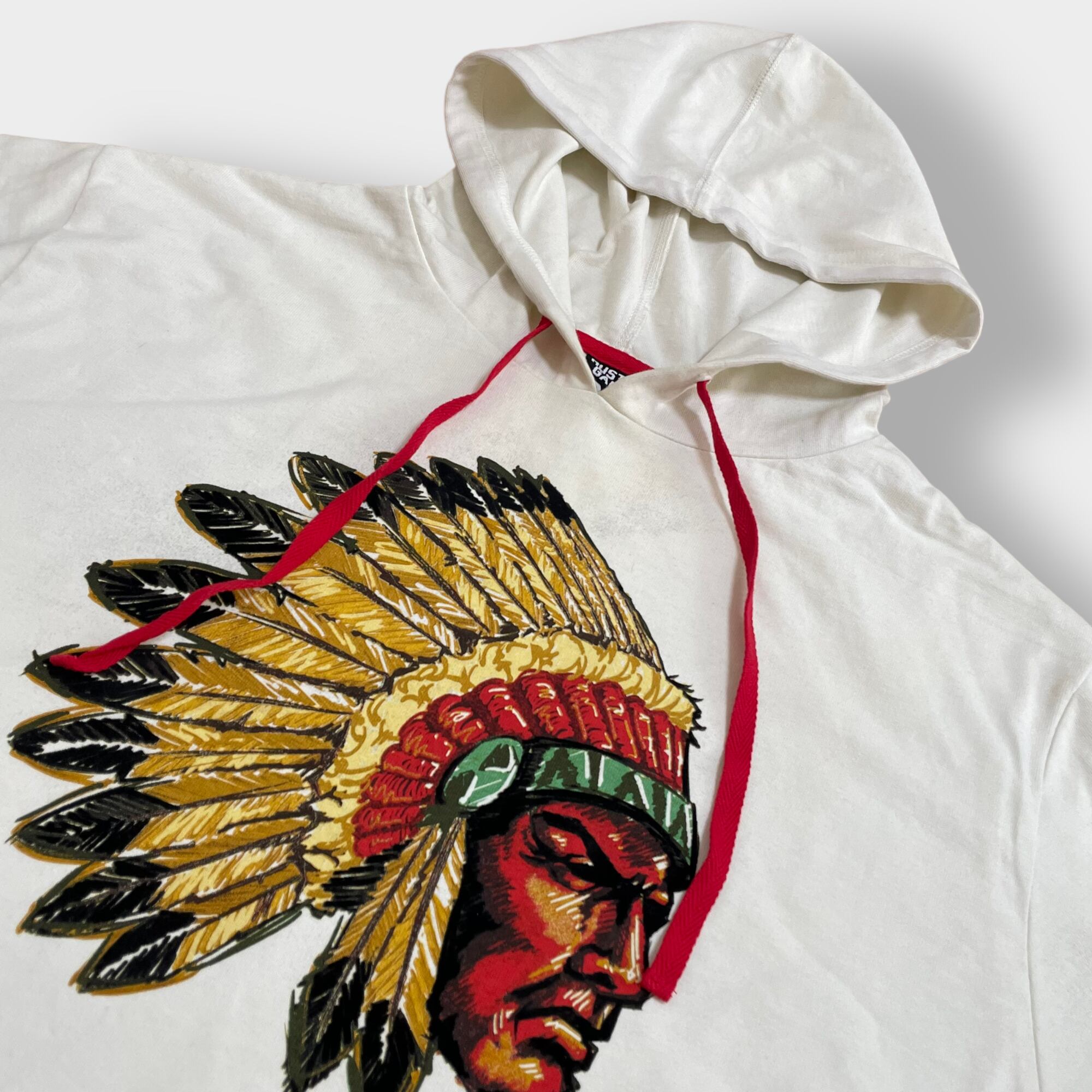 【HUSTLE GANG】パーカー プルオーバー インディアン プリント 袖ロゴ ラインリブ フーディー スウェット 2X ビッグサイズ US古着