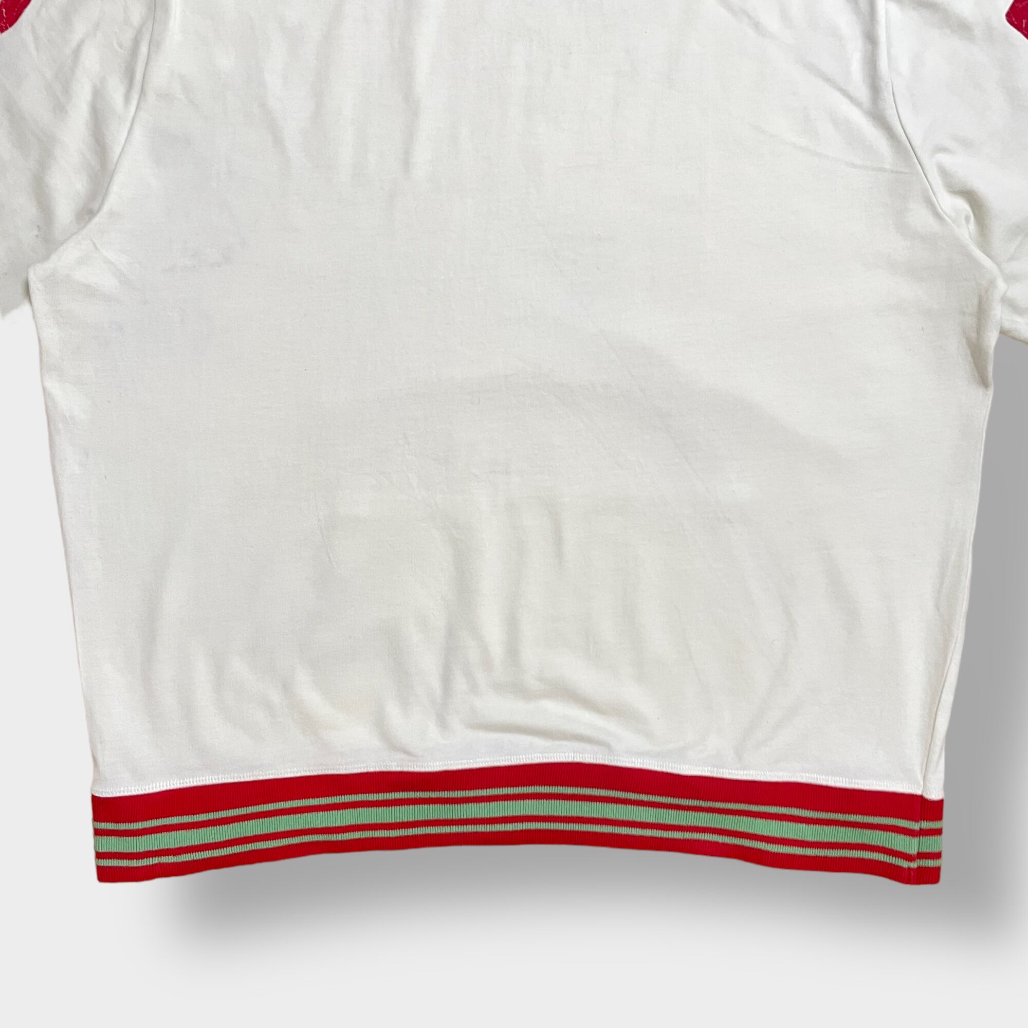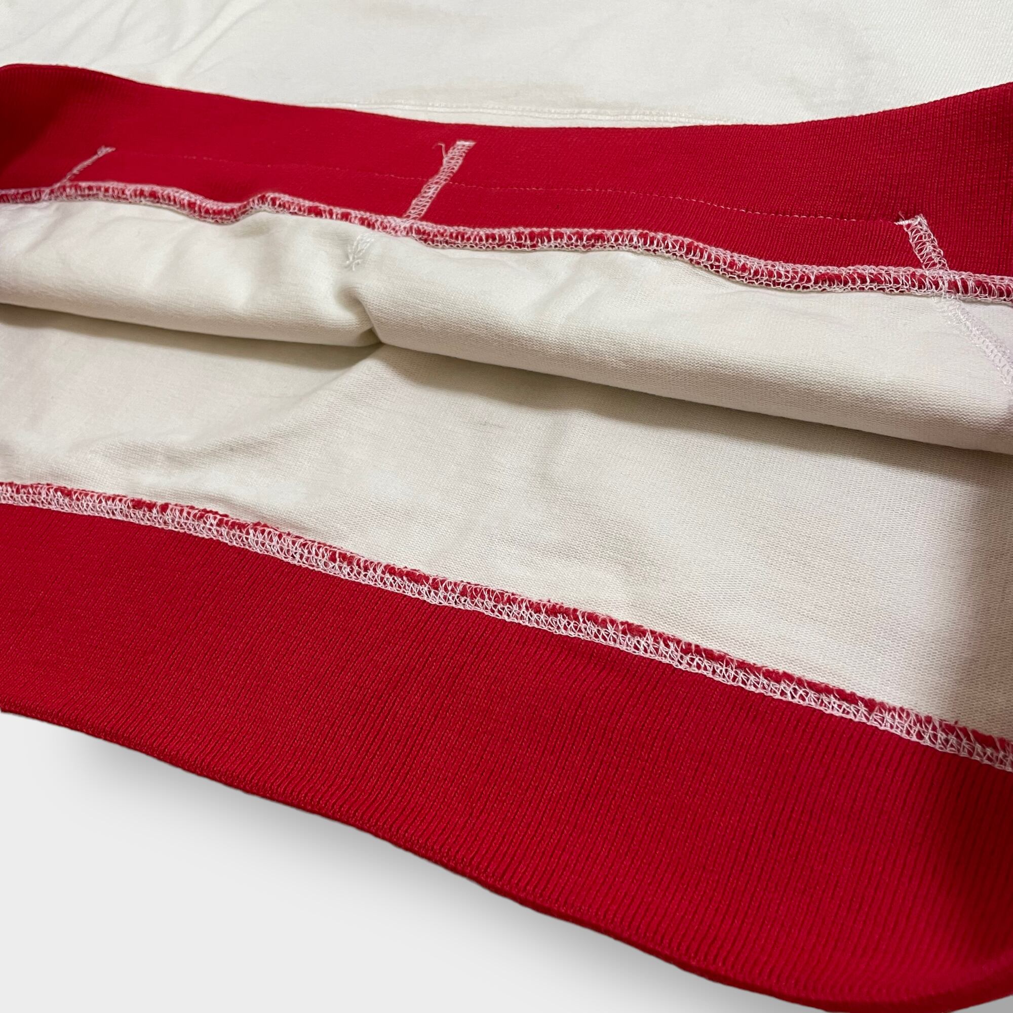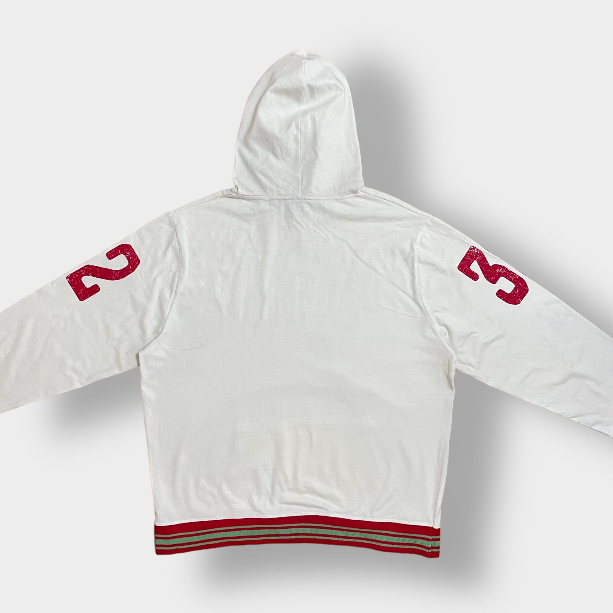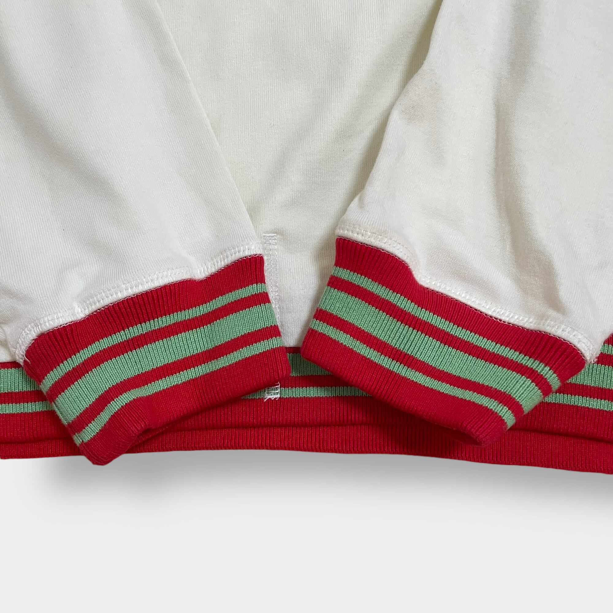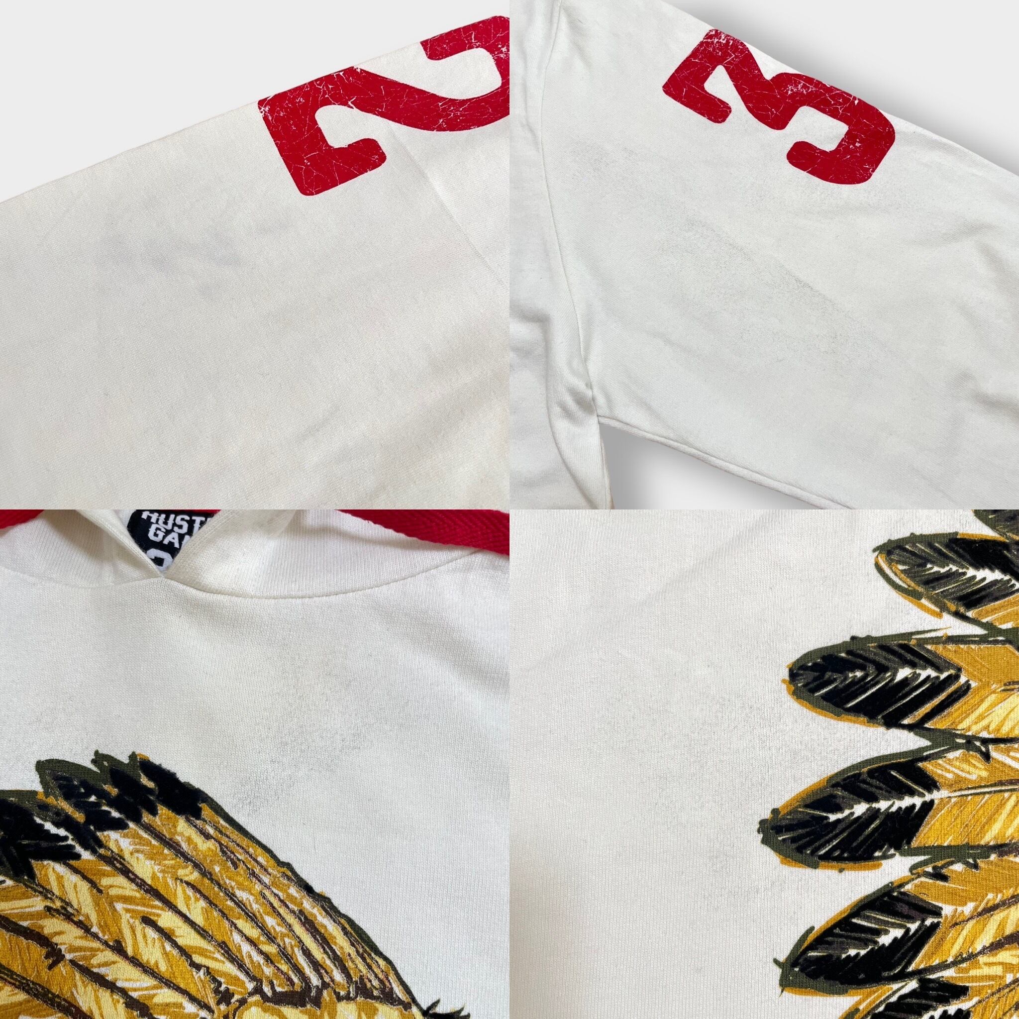 インディアンプリント、プルオーバー、袖にナンバリングプリント、リブはライン入りです。