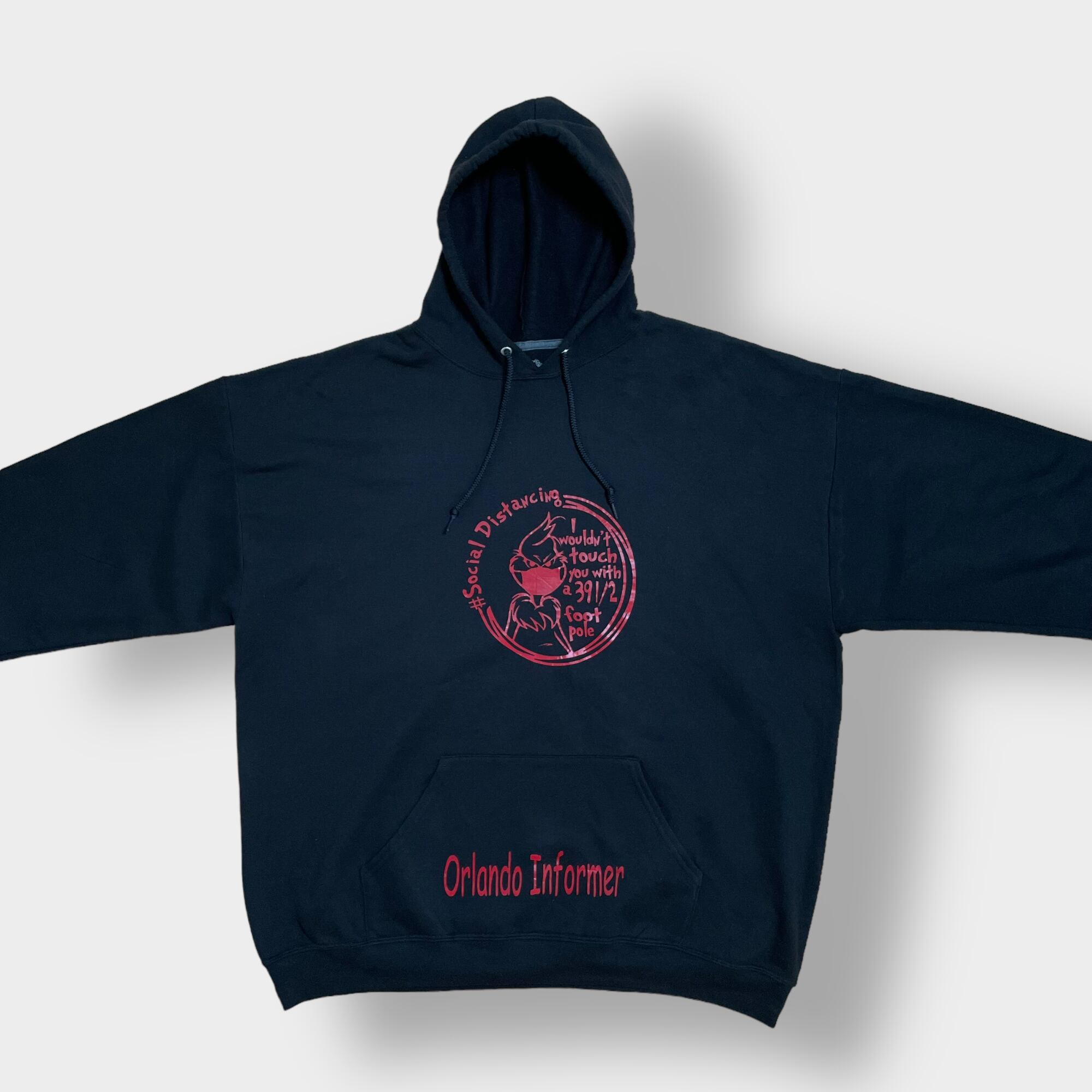 胸とカンガルーポケット上にプリント入り、サイズ表記は2XLのビッグサイズです。