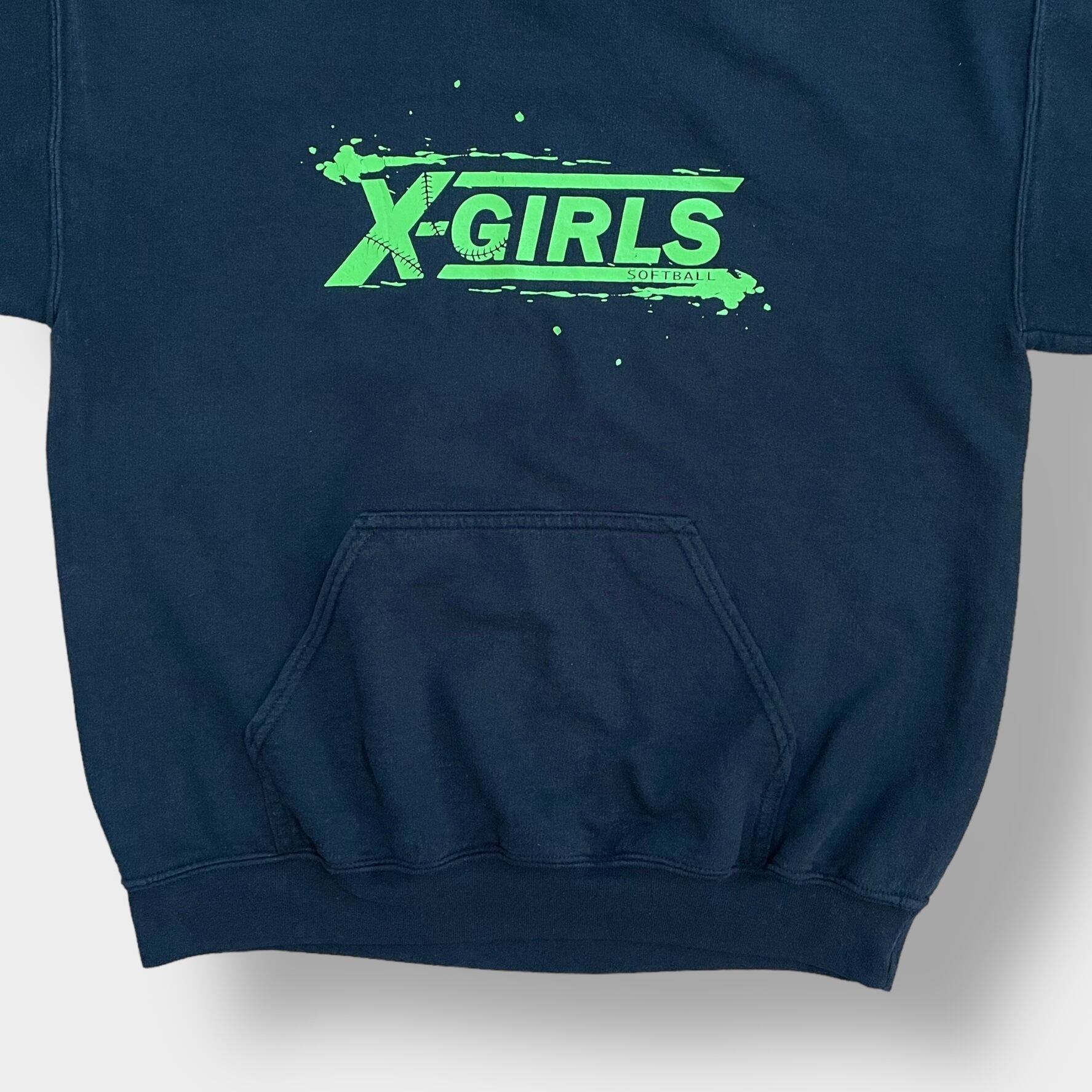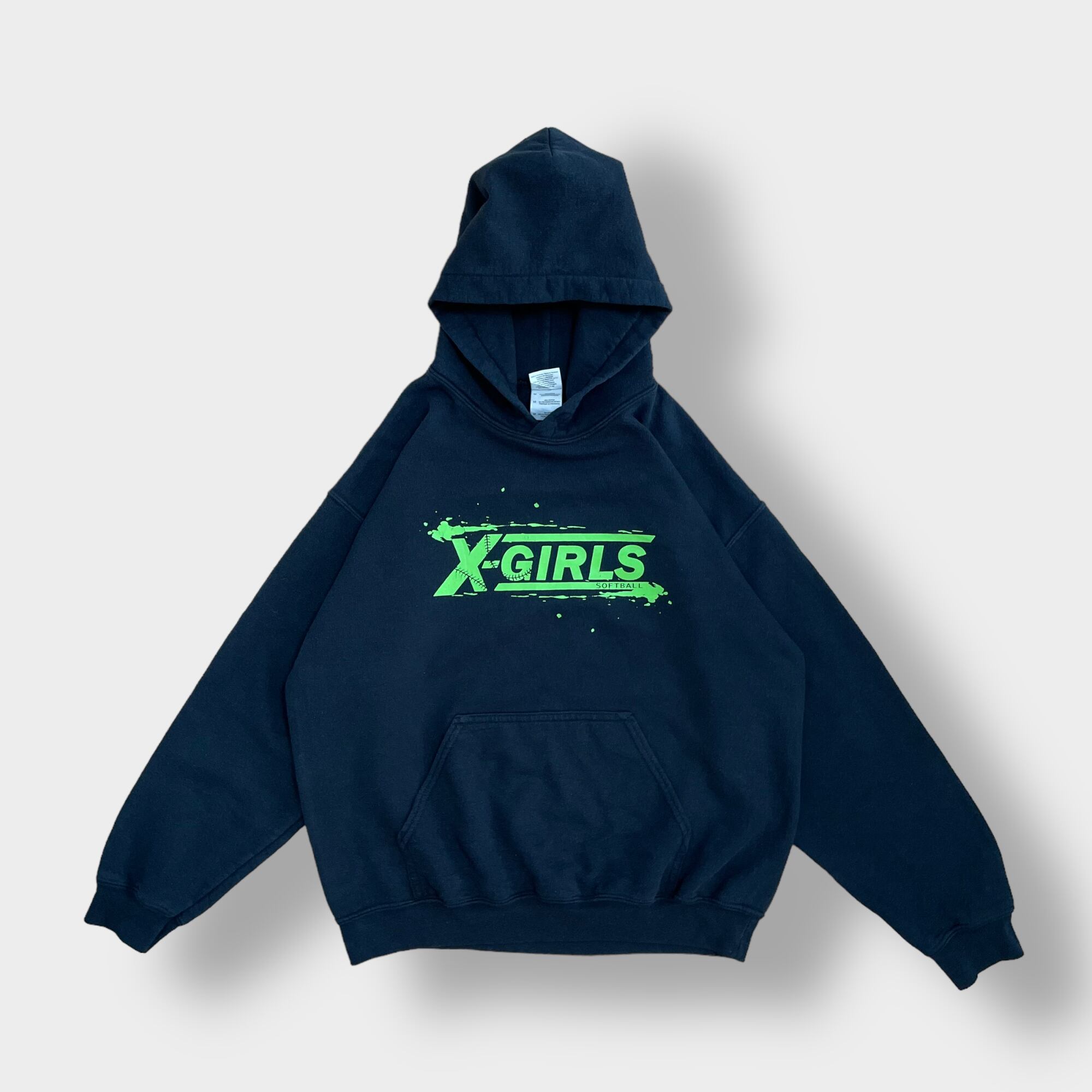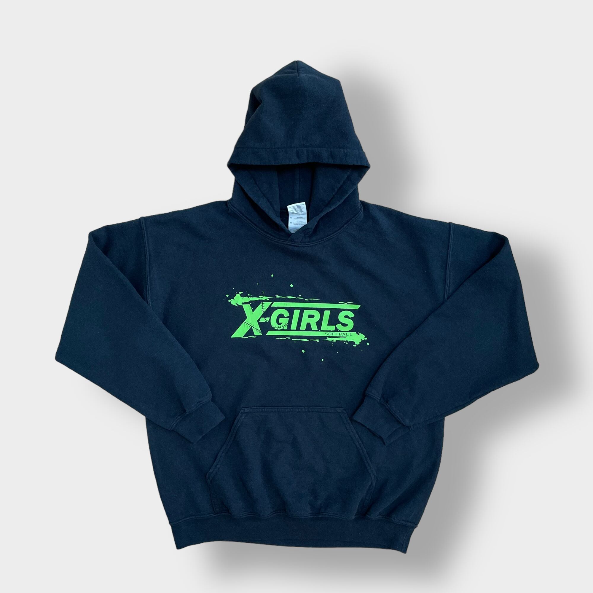 GILDAN パーカー プルオーバー スウェット フーディー X-GIRLS SOFTBALL ソフトボール ロゴ プリント バックプリント 黒 M us古着