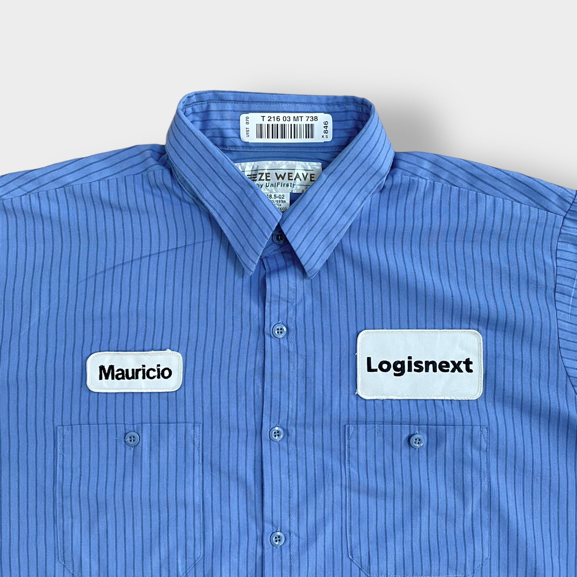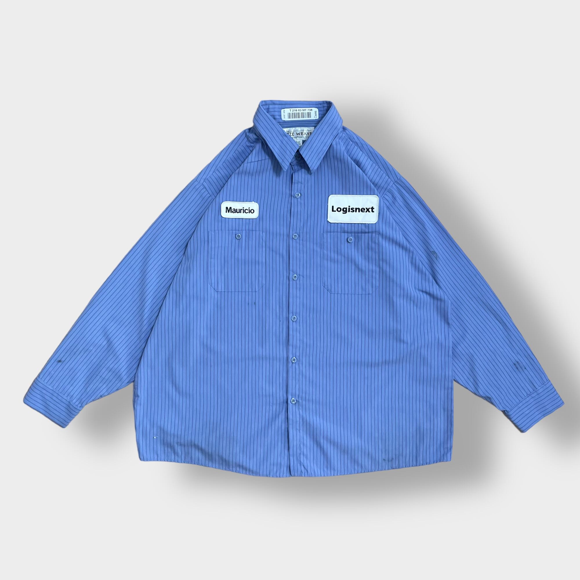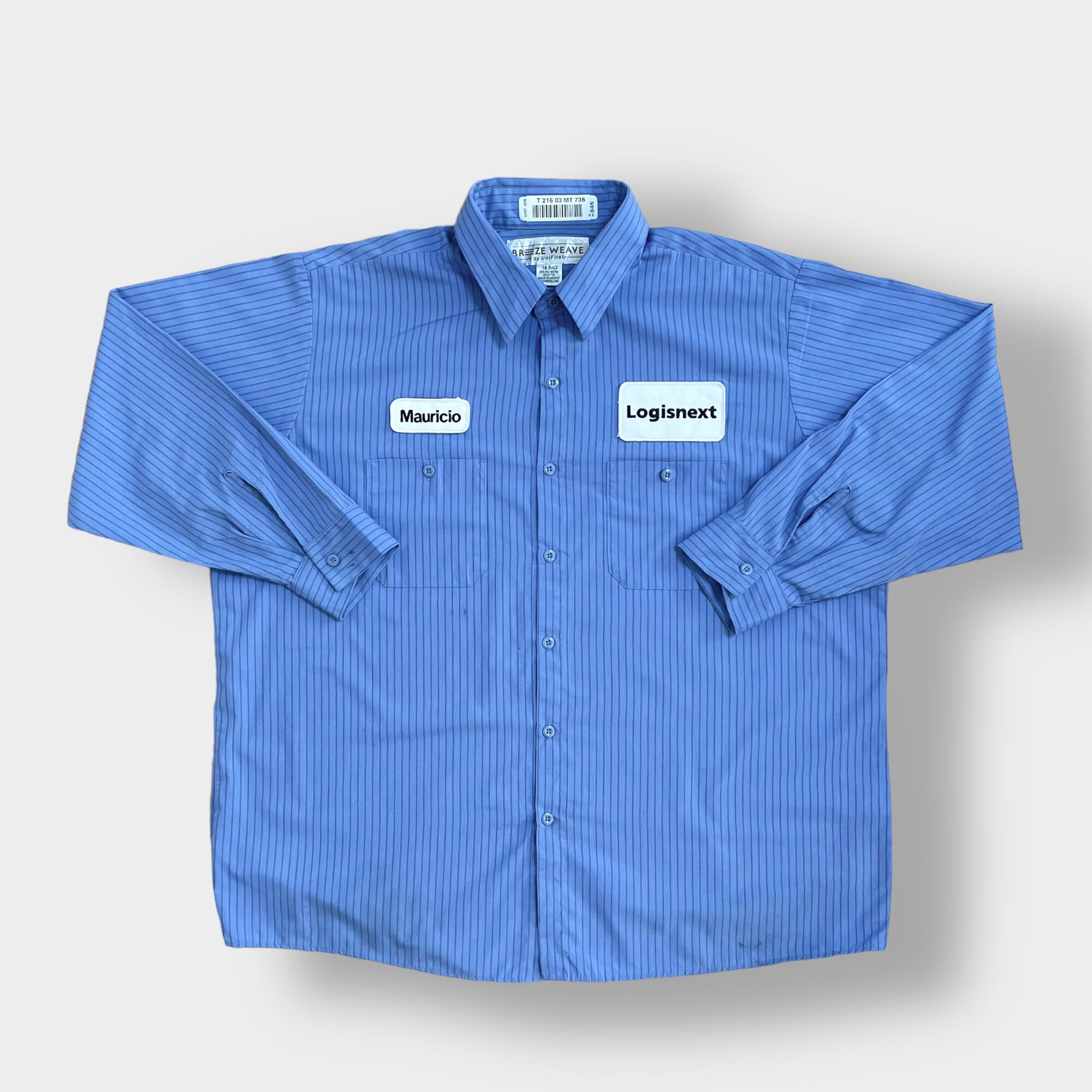 【BREEZE WEAVE】MEXICO製 ワークシャツ ストライプ 企業ロゴ 企業系 三菱ロジスネクスト 長袖シャツ ワッペン XL相当 ビッグサイズ US古着