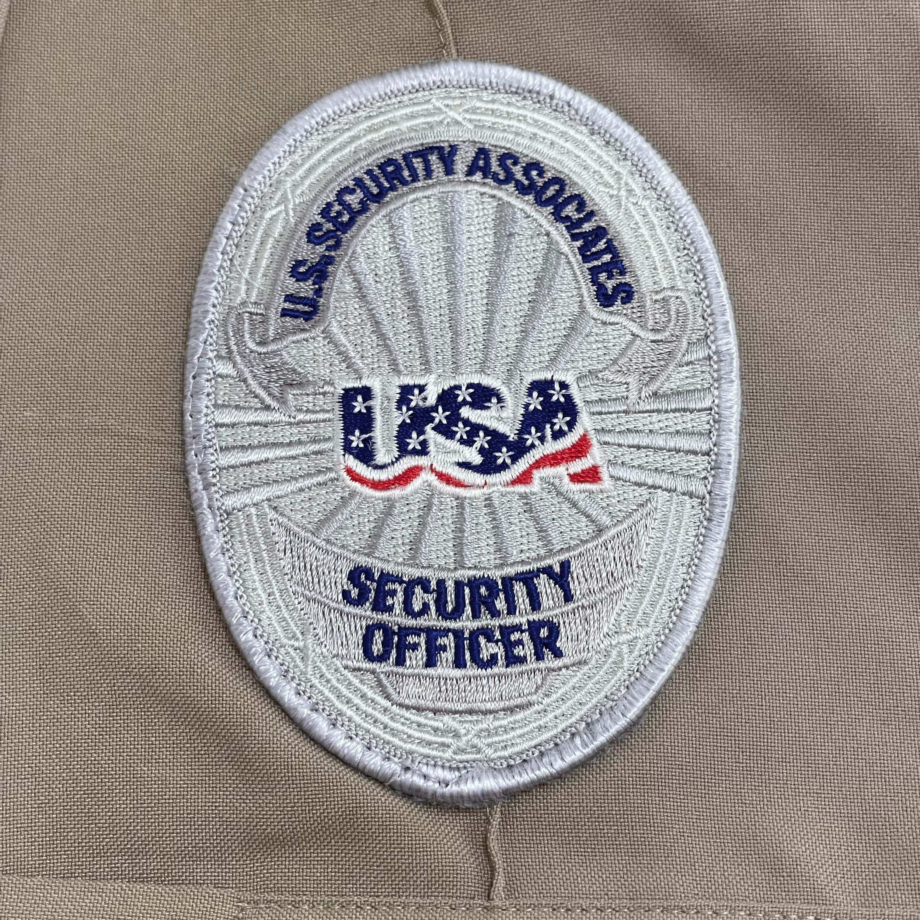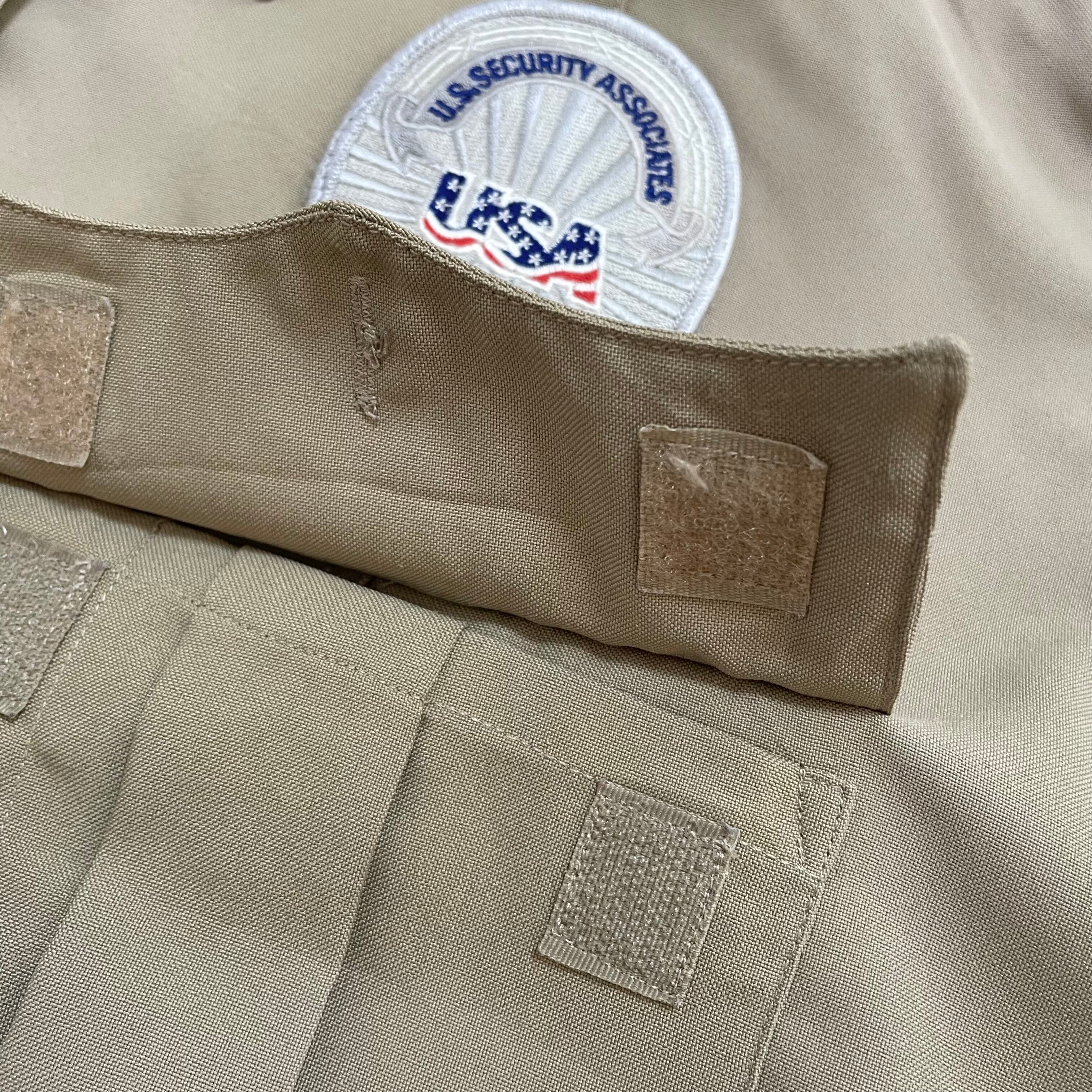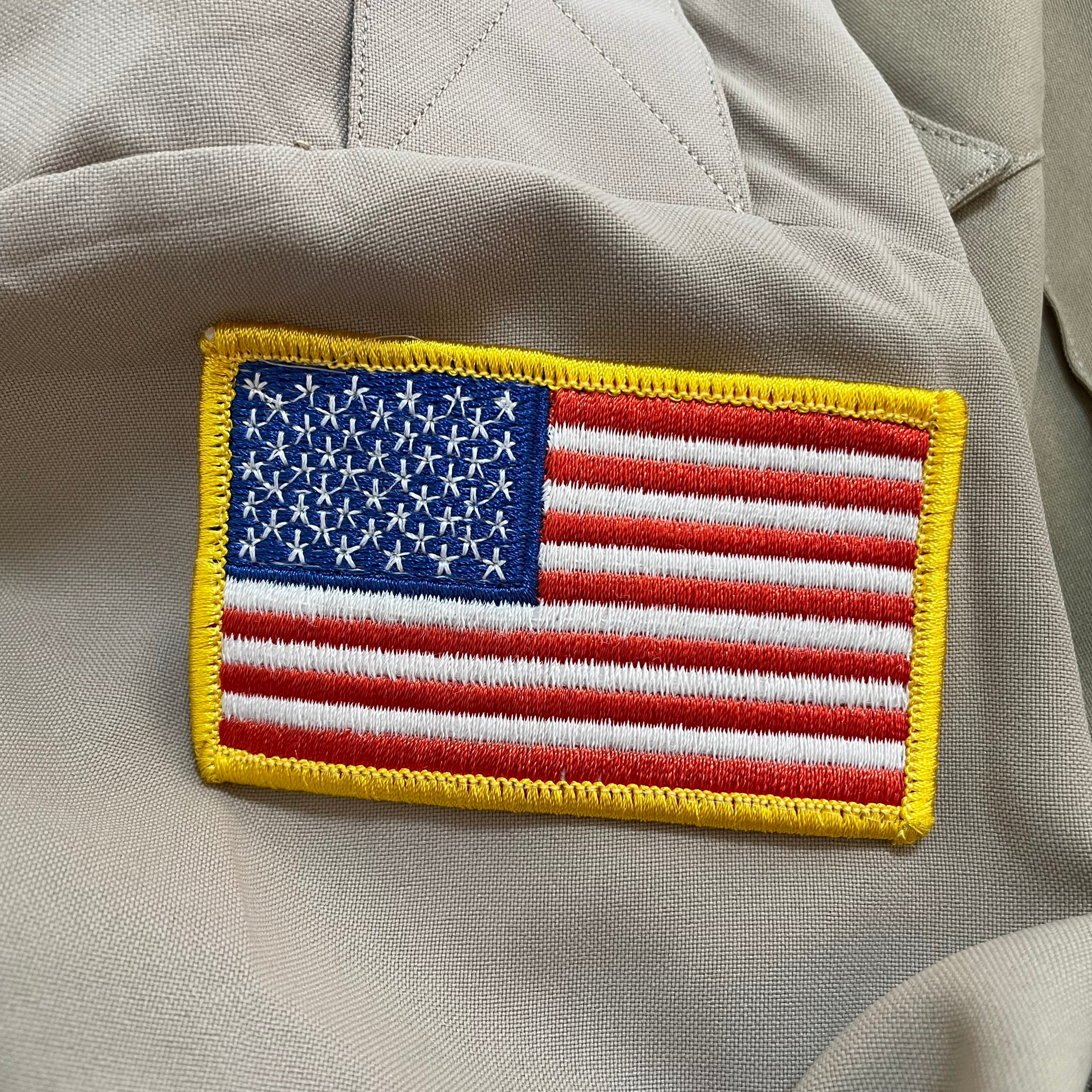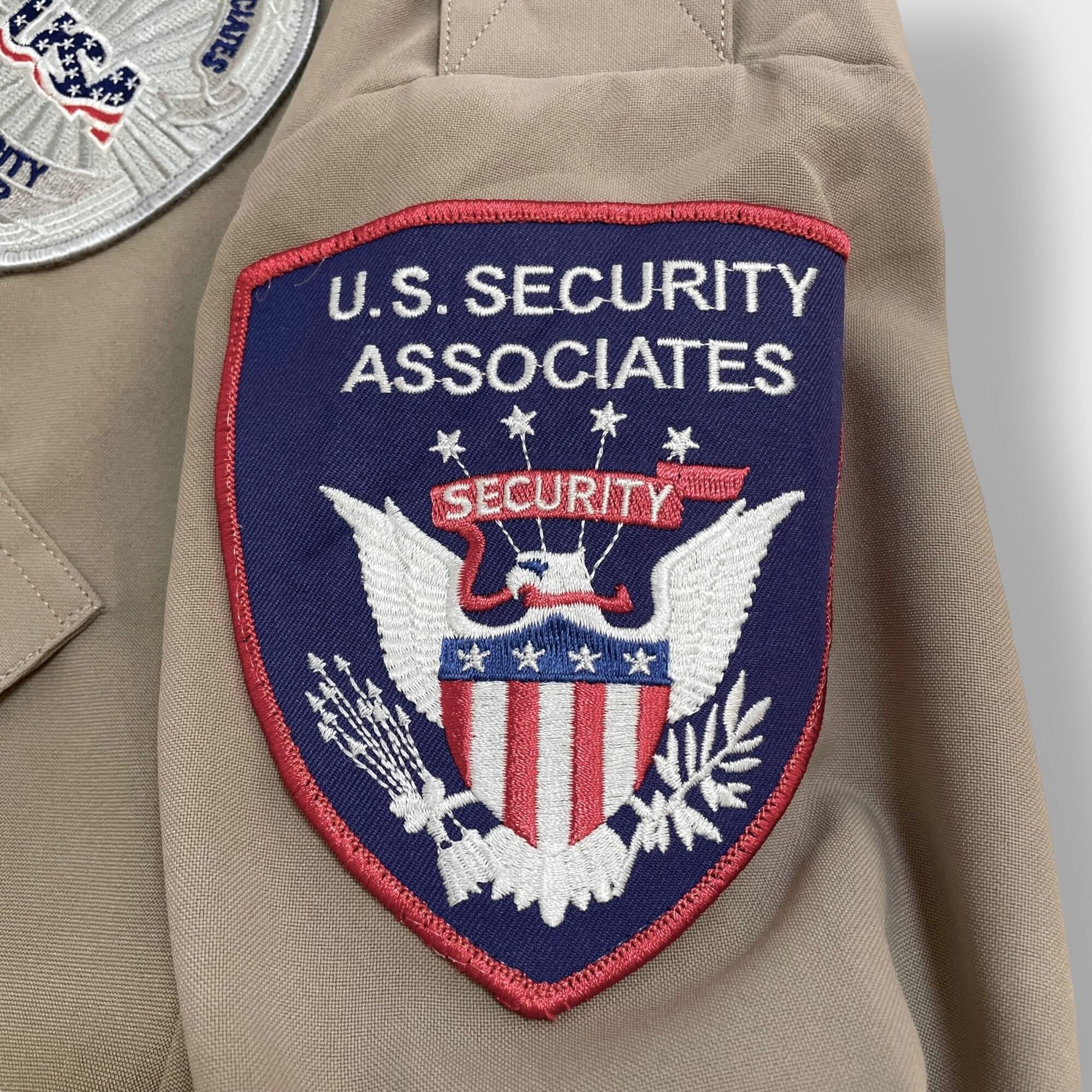 胸ポケット付き(ダミーボタンで開閉はマジックテープ)、エポーレット、左胸、左袖にUSセキュリティのワッペン、右袖に星条旗のワッペン付きです。