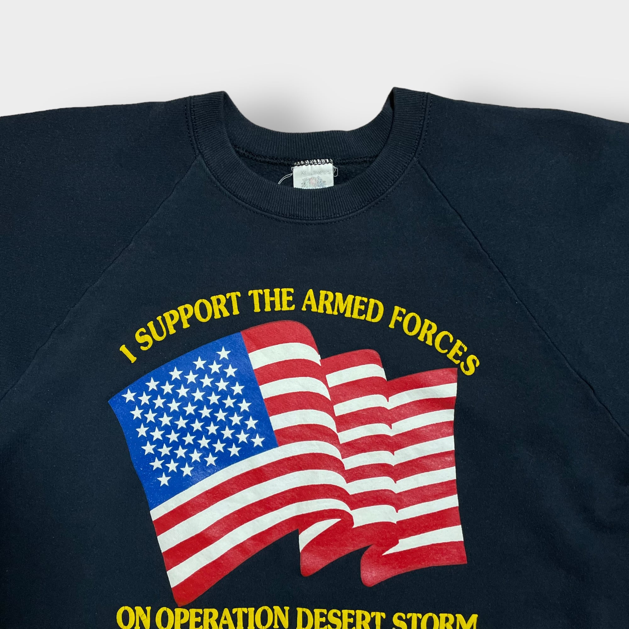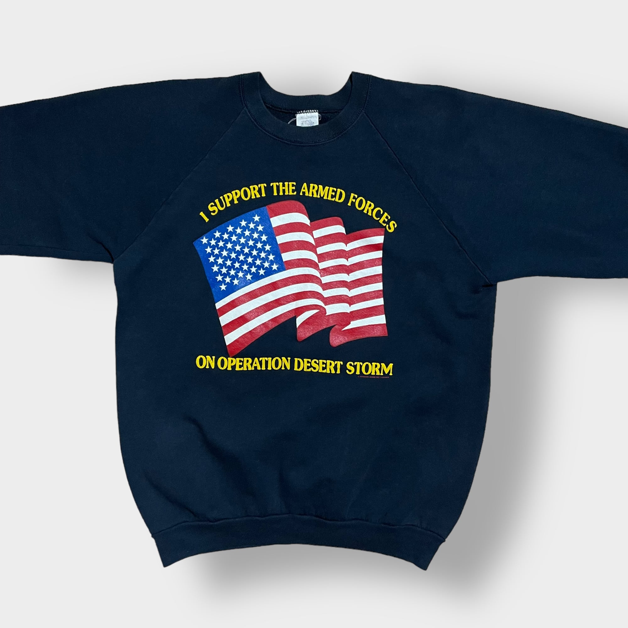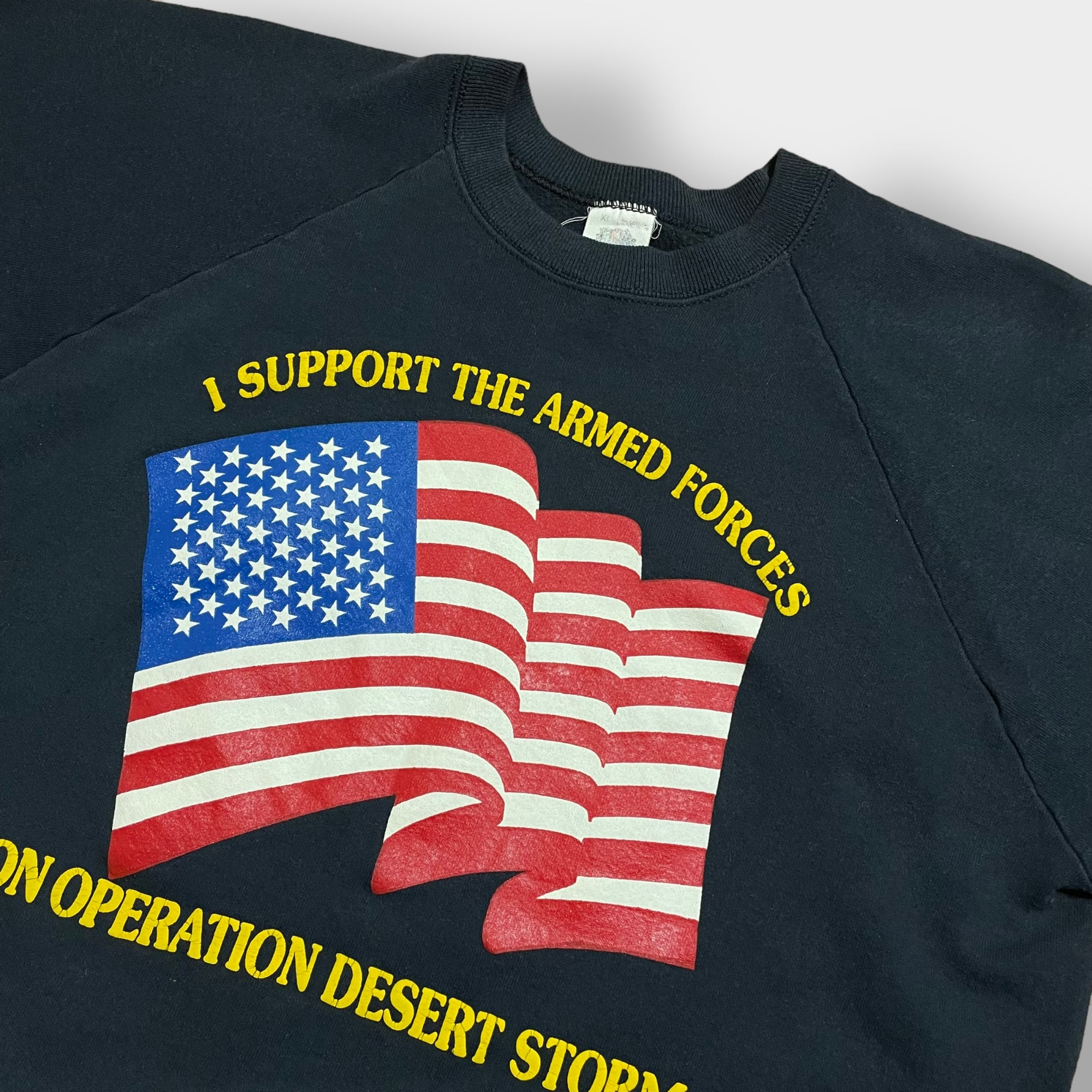 フロントにアーチロゴ、星条旗のプリント入り。80sから90s頃のUSA製、袖はラグランでオールドの雰囲気がある一着です。