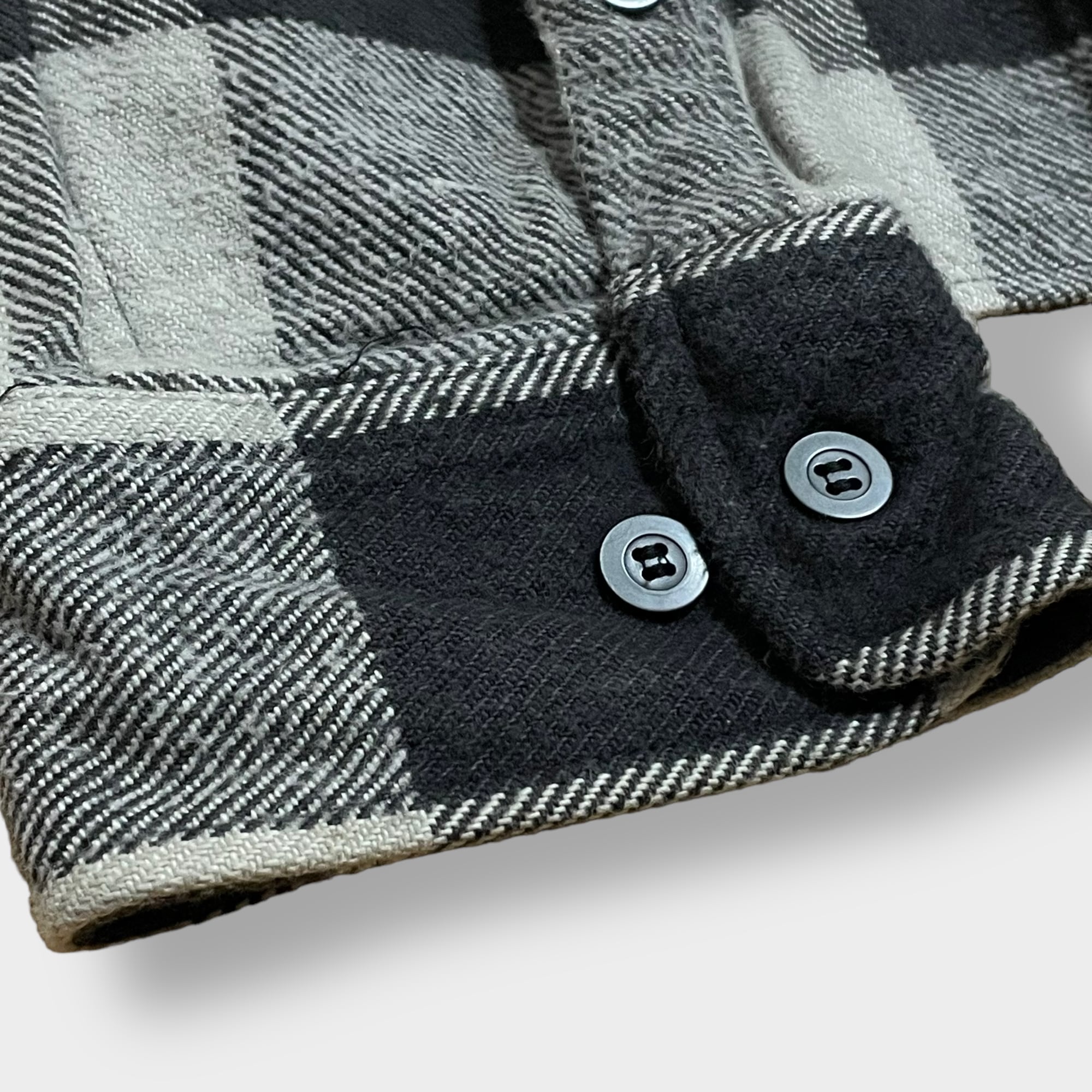 ブラック&グレーのブロックチェック、フラップポケット、ネルシャツでは珍しいノーカラーでスッキリとした印象の一着です。