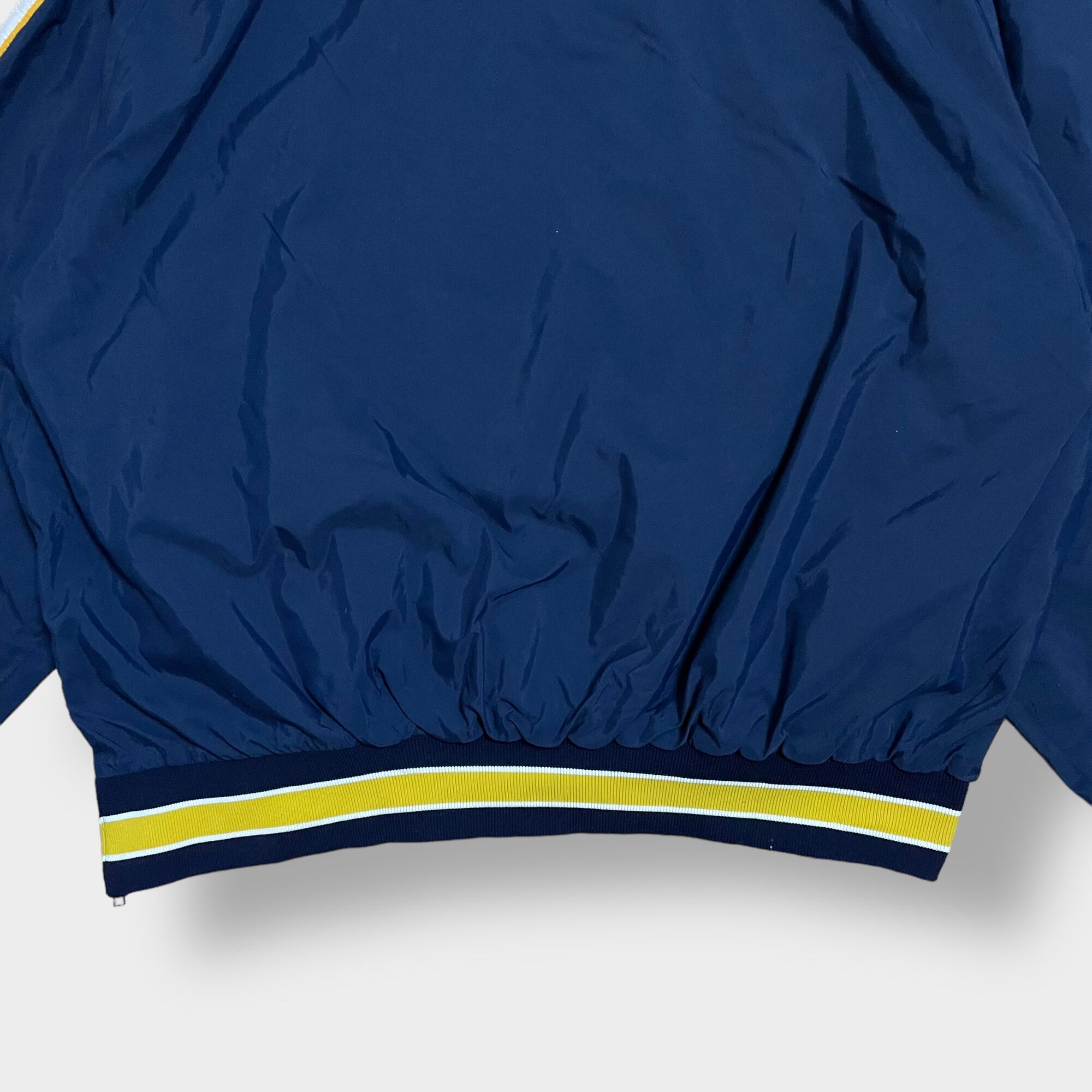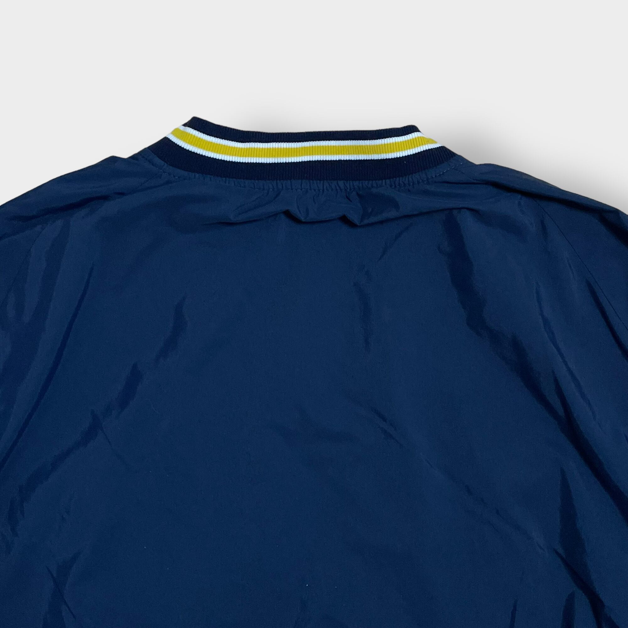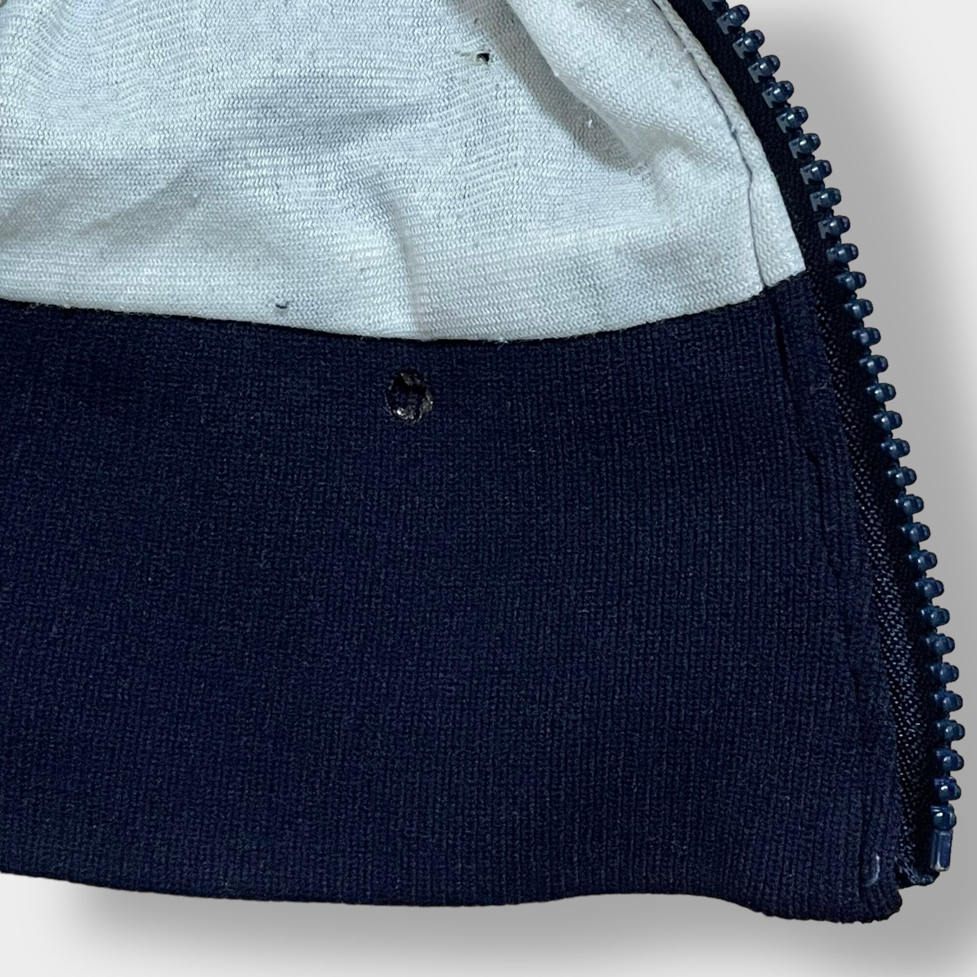 ネイビーのボディー、胸に刺繍ロゴ、Vネック、ラインリブ、ラグランスリーブ、サイドポケット×2、左裾チャック付きです。