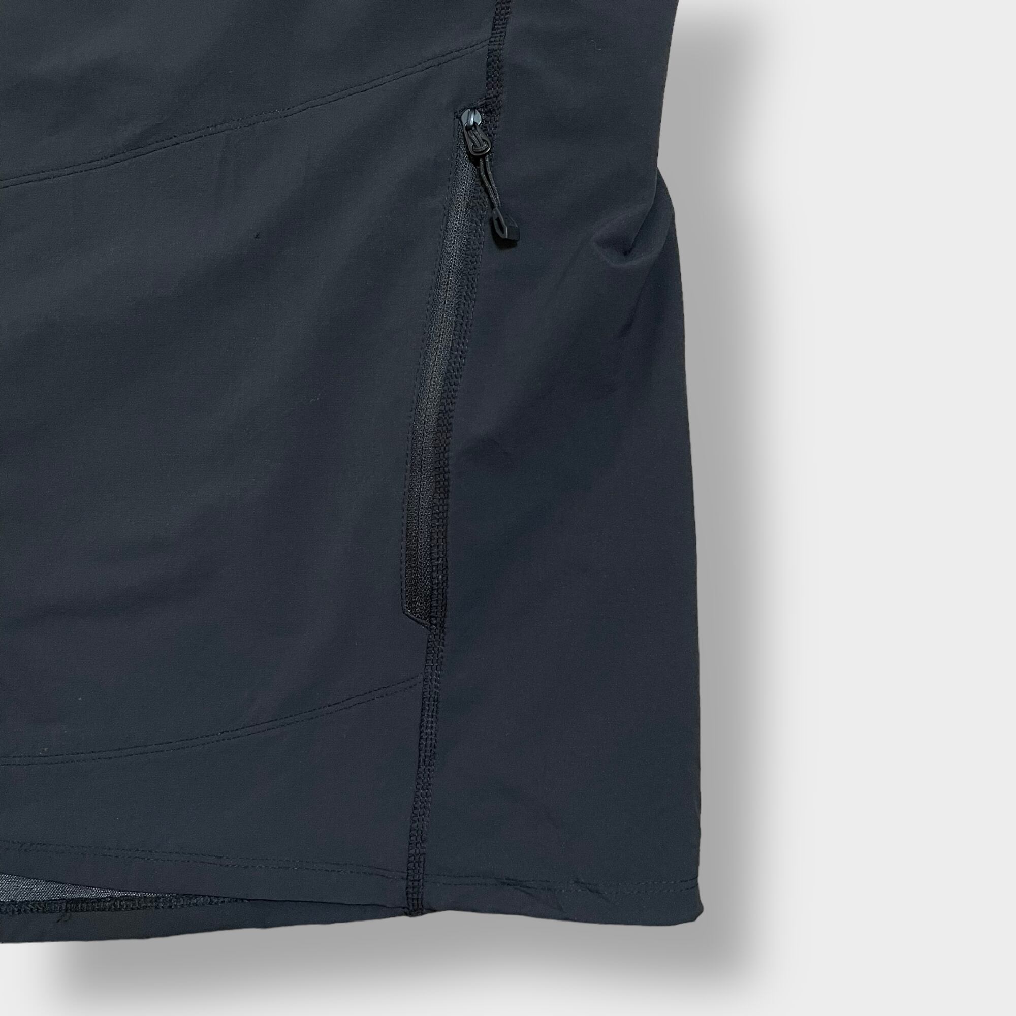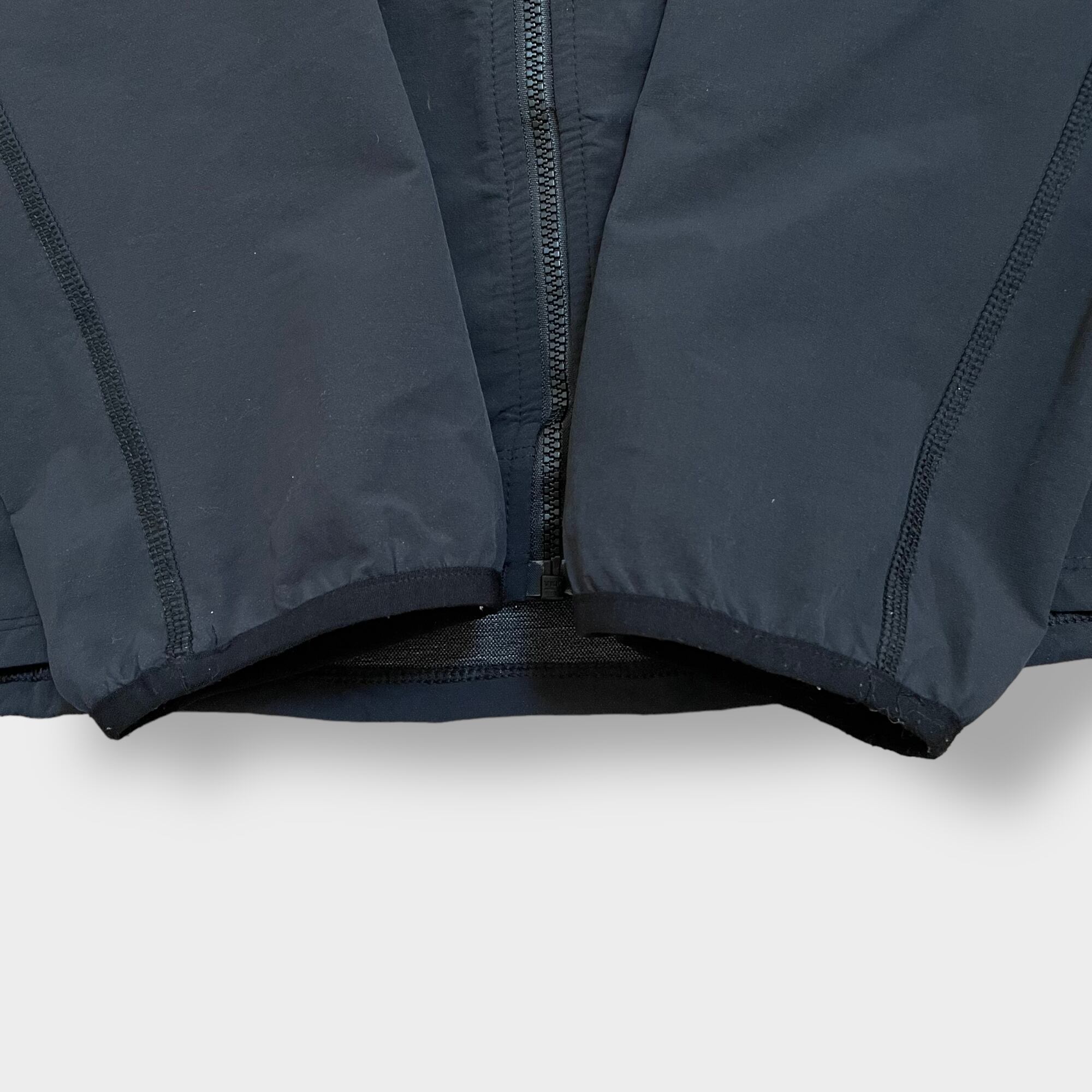 黒ボディ、胸にブランドのワンポイントロゴ、フロントジップアップ、ジップ付き胸ポケット×1、サイドポケット×2、裾はドローコード付きで絞り調整可能です。