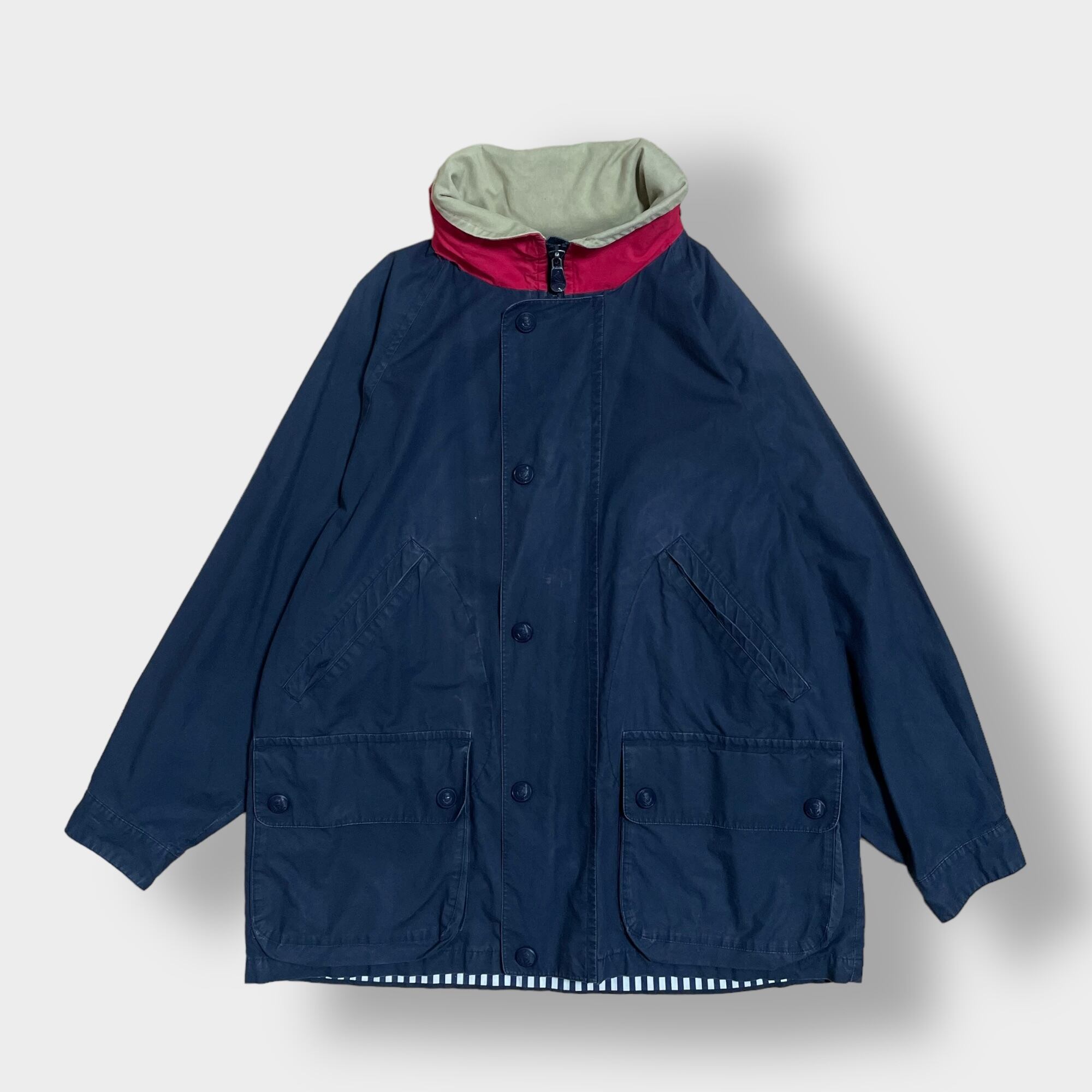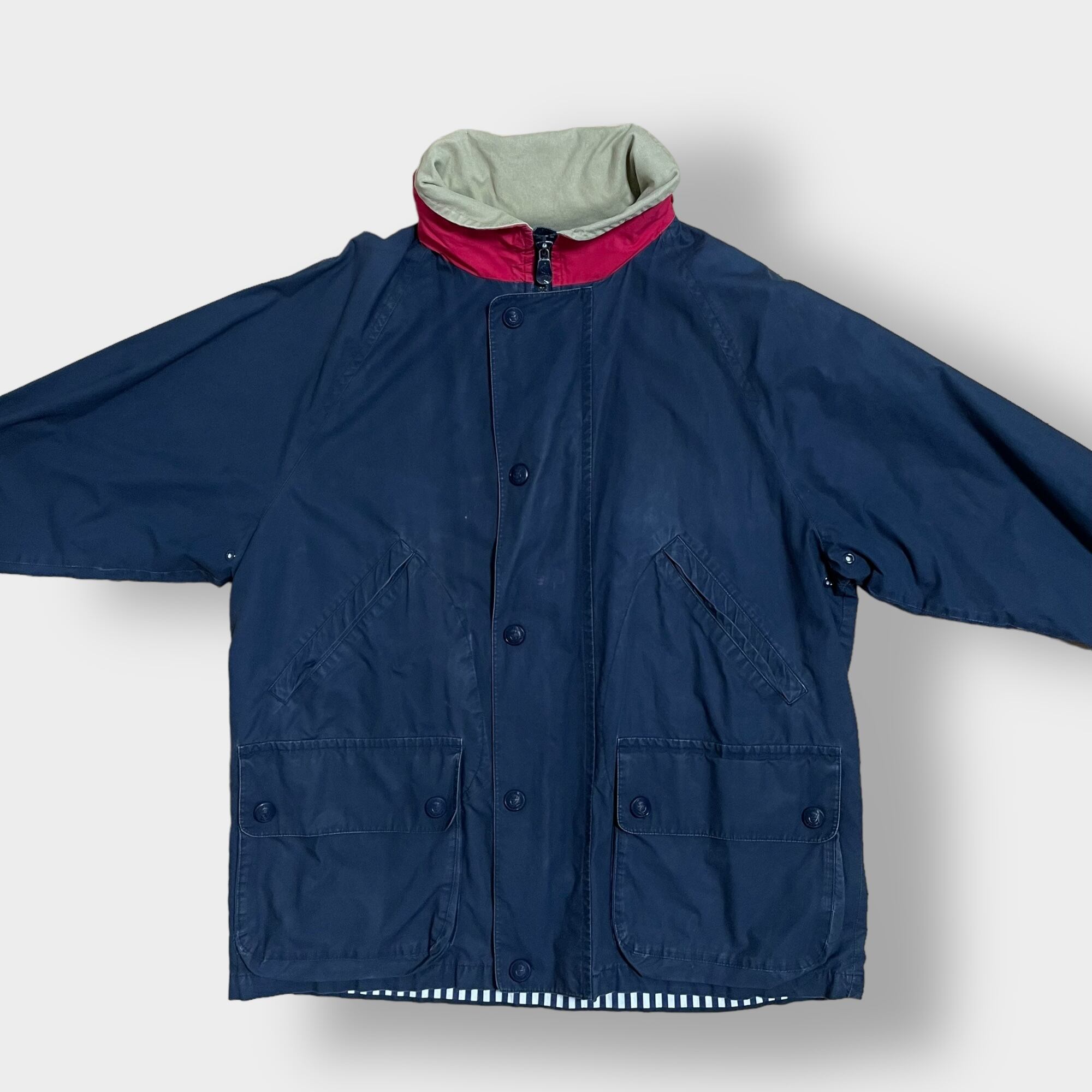 ネイビーのボディに襟周りがレッド×ベージュ、裏地がストライプのオシャレな一着です。